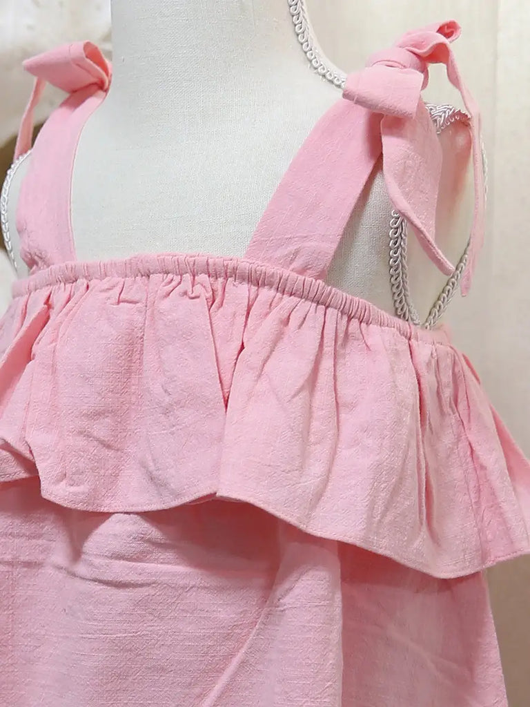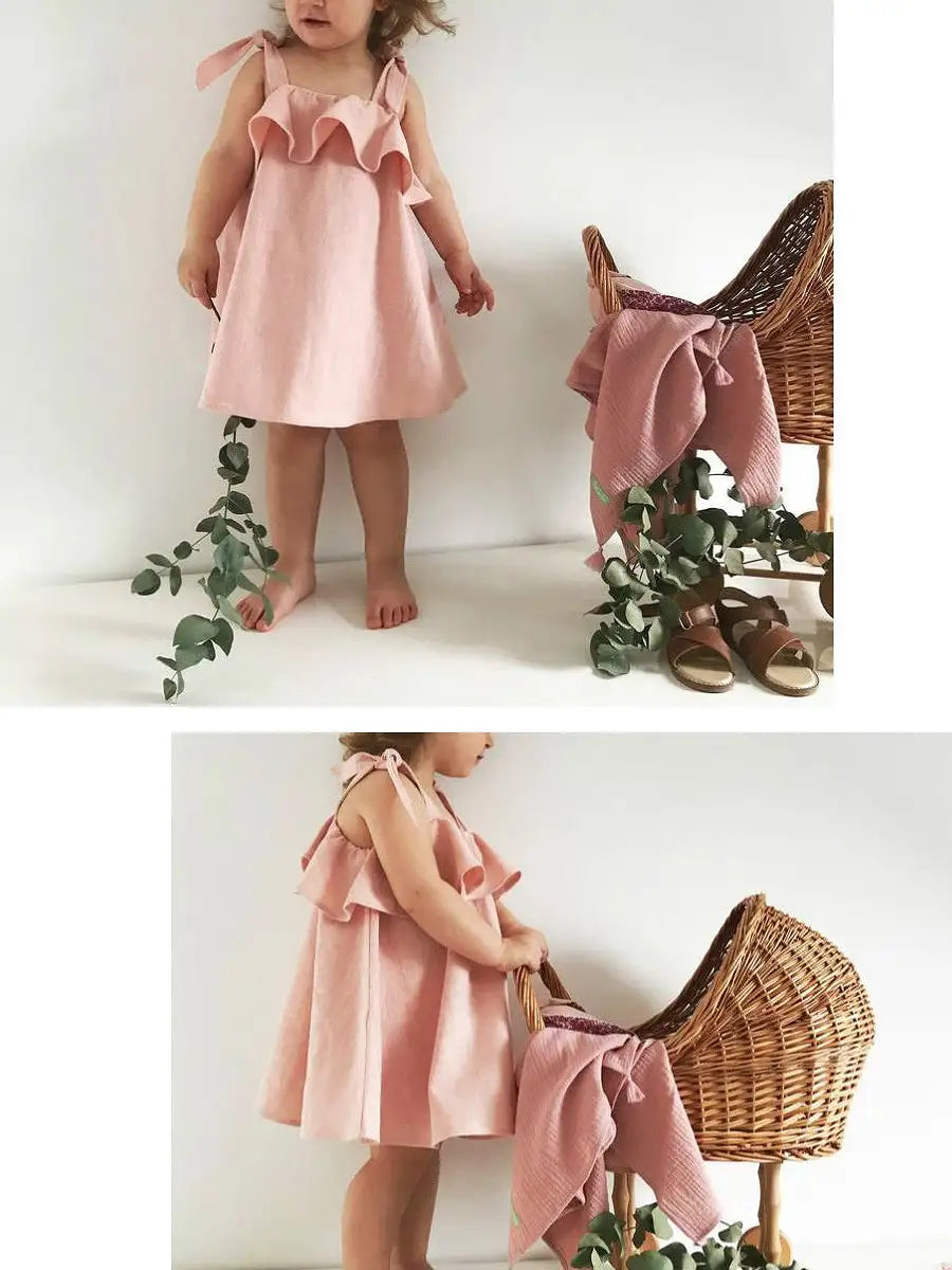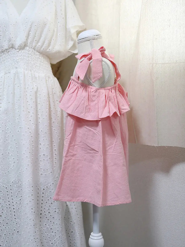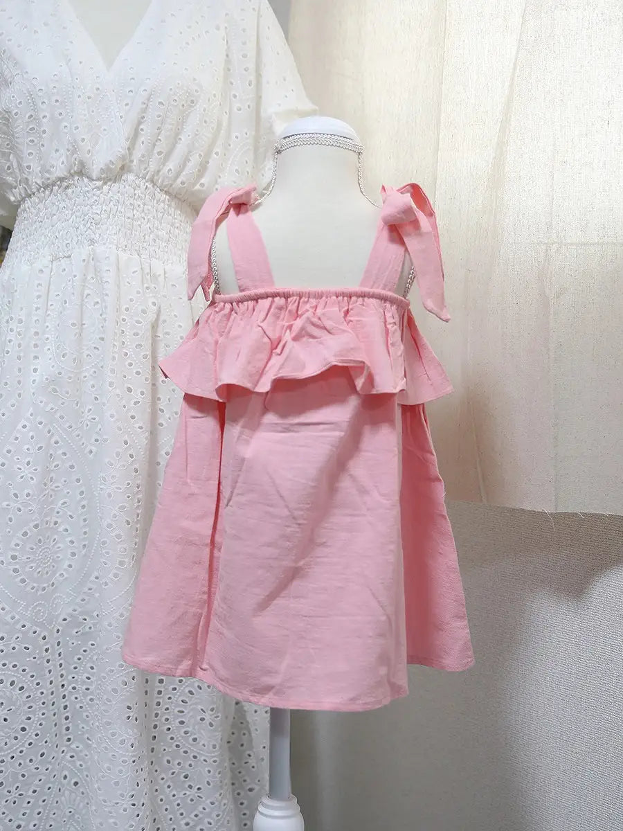 肩紐部分を結ぶリボンデザインの綿麻ワンピース。
