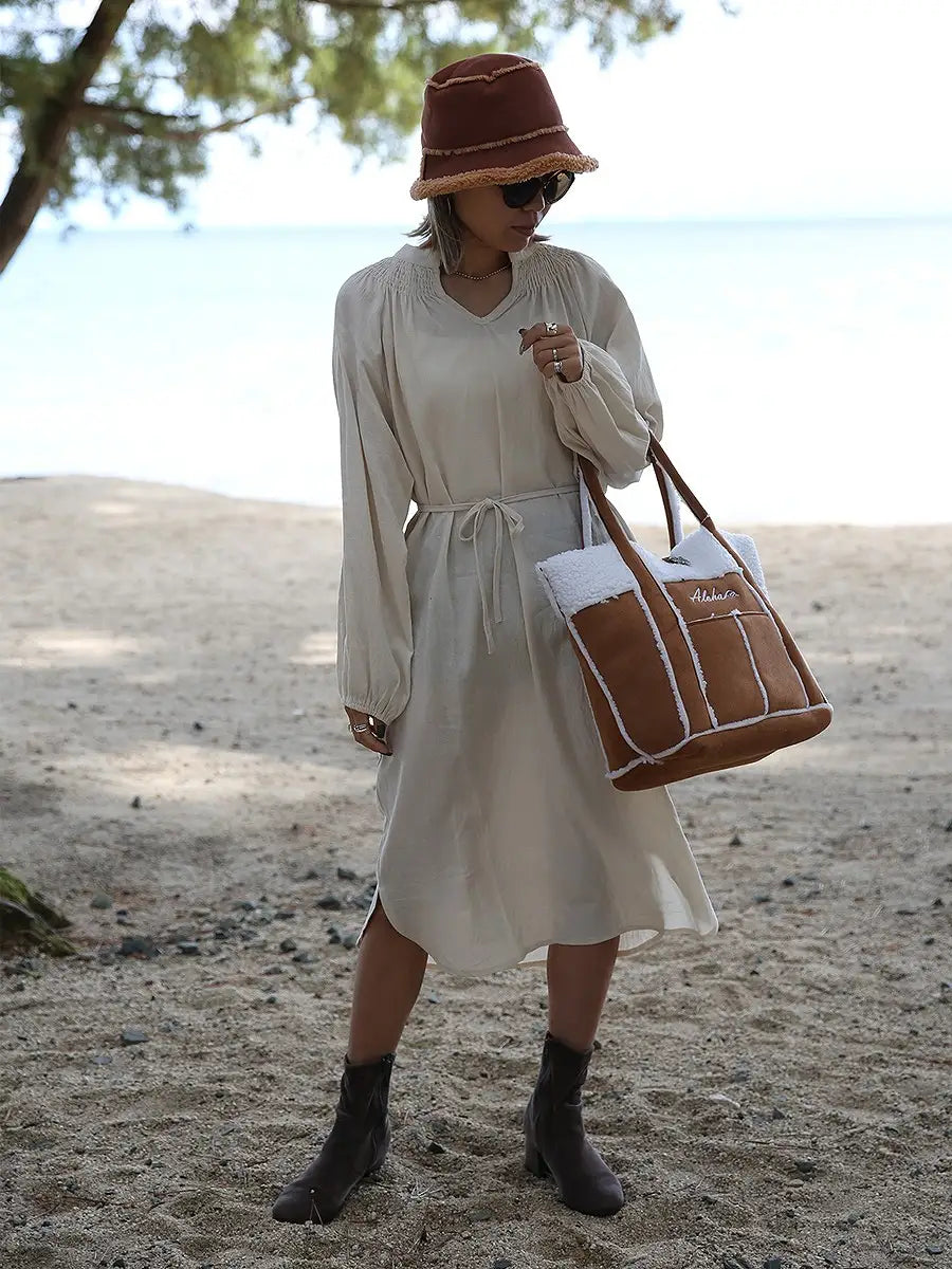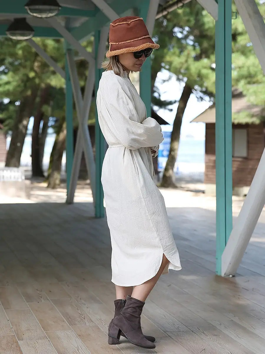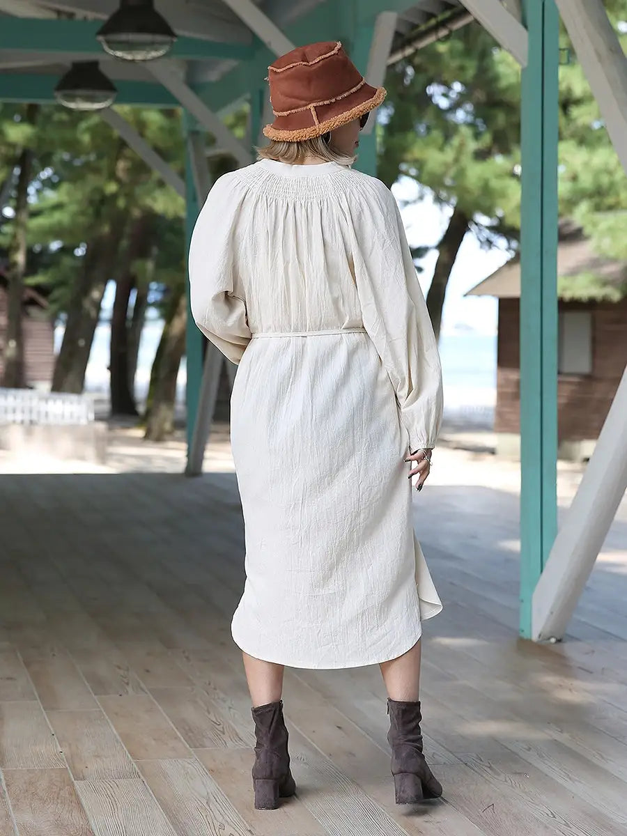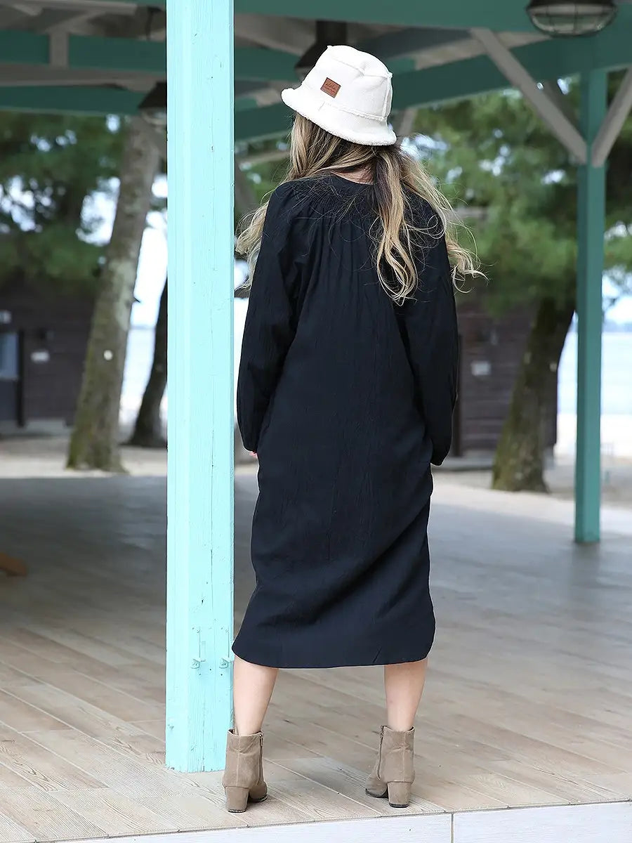 roomy by the sea(ルーミーバイザシー)シンプルな長袖ミモレ丈ワンピース。