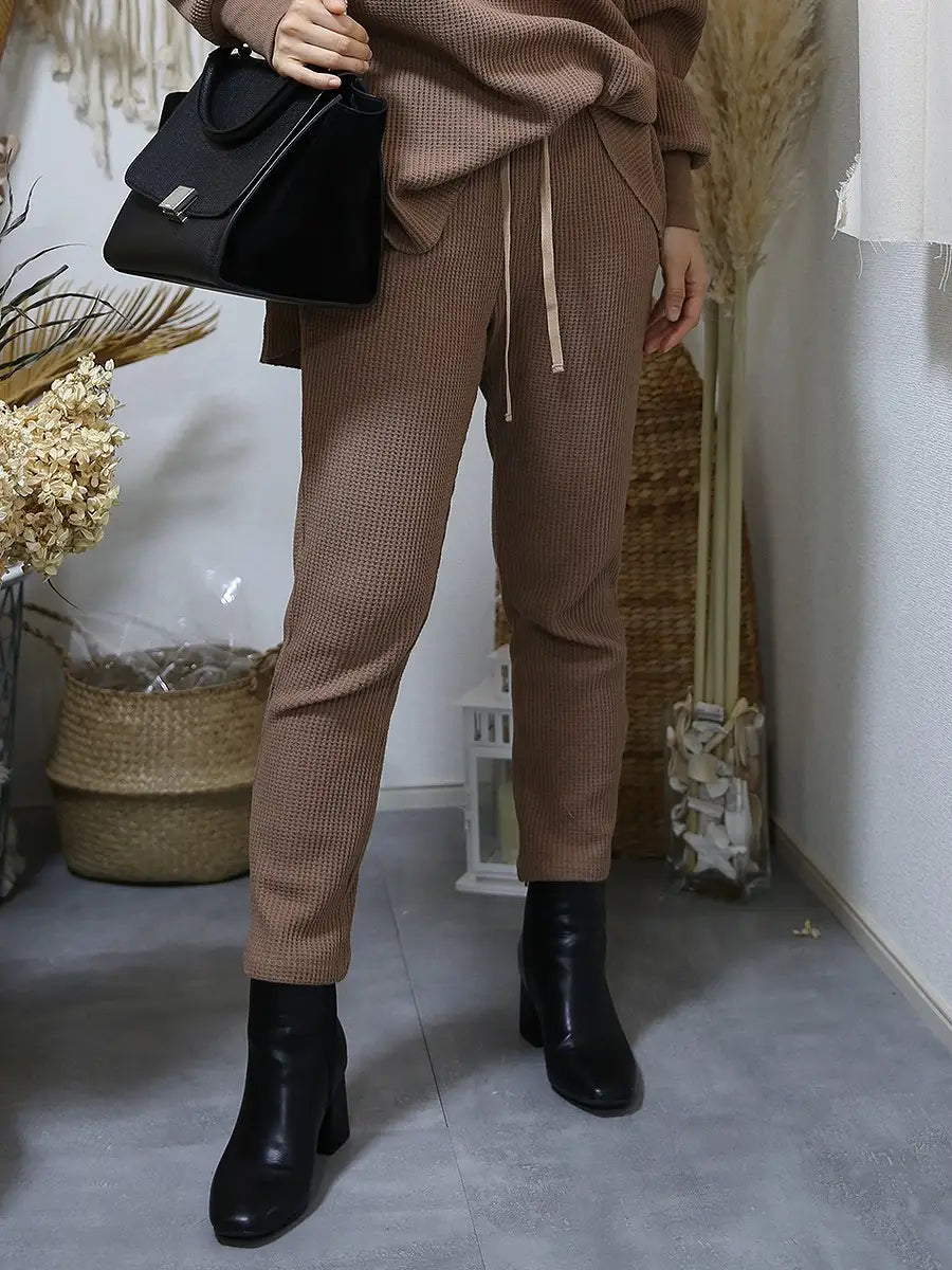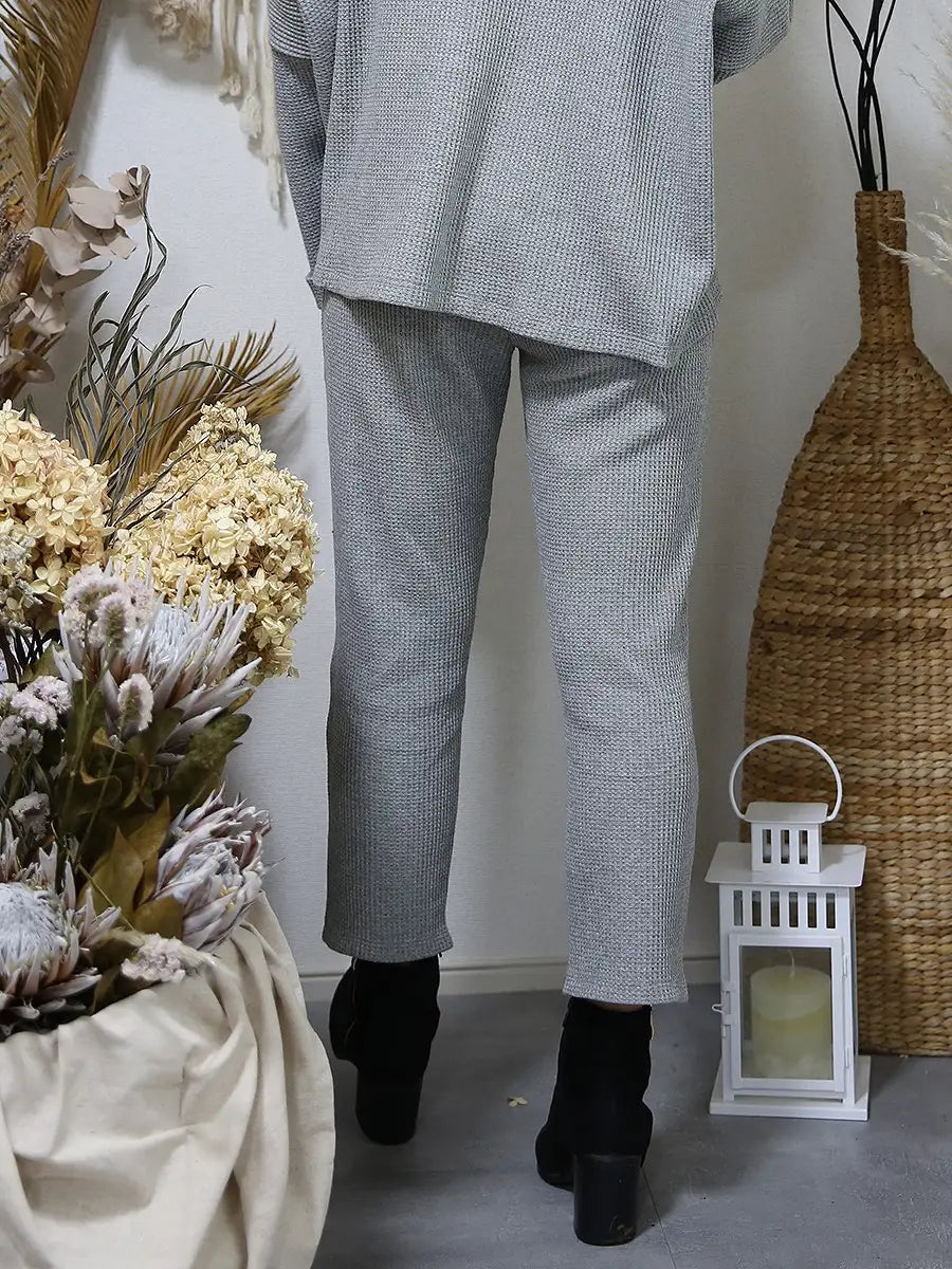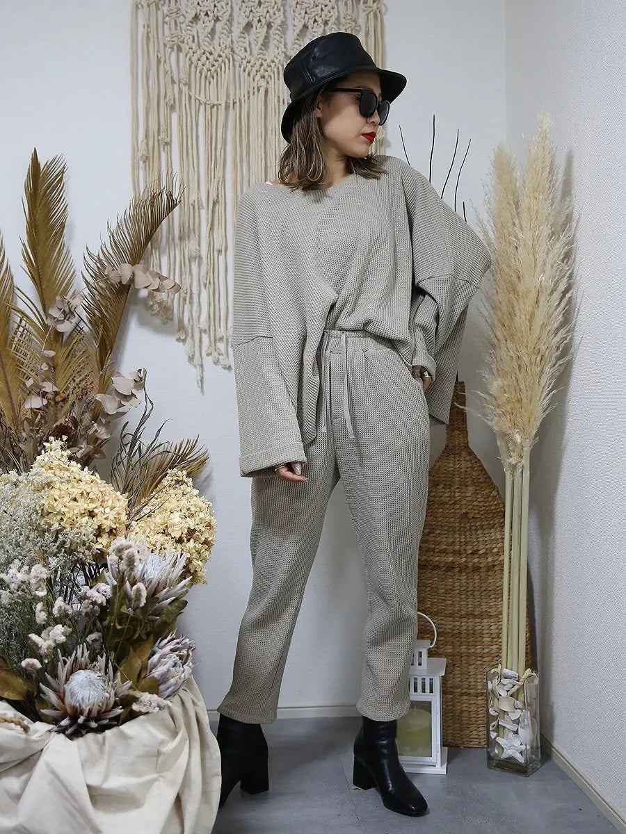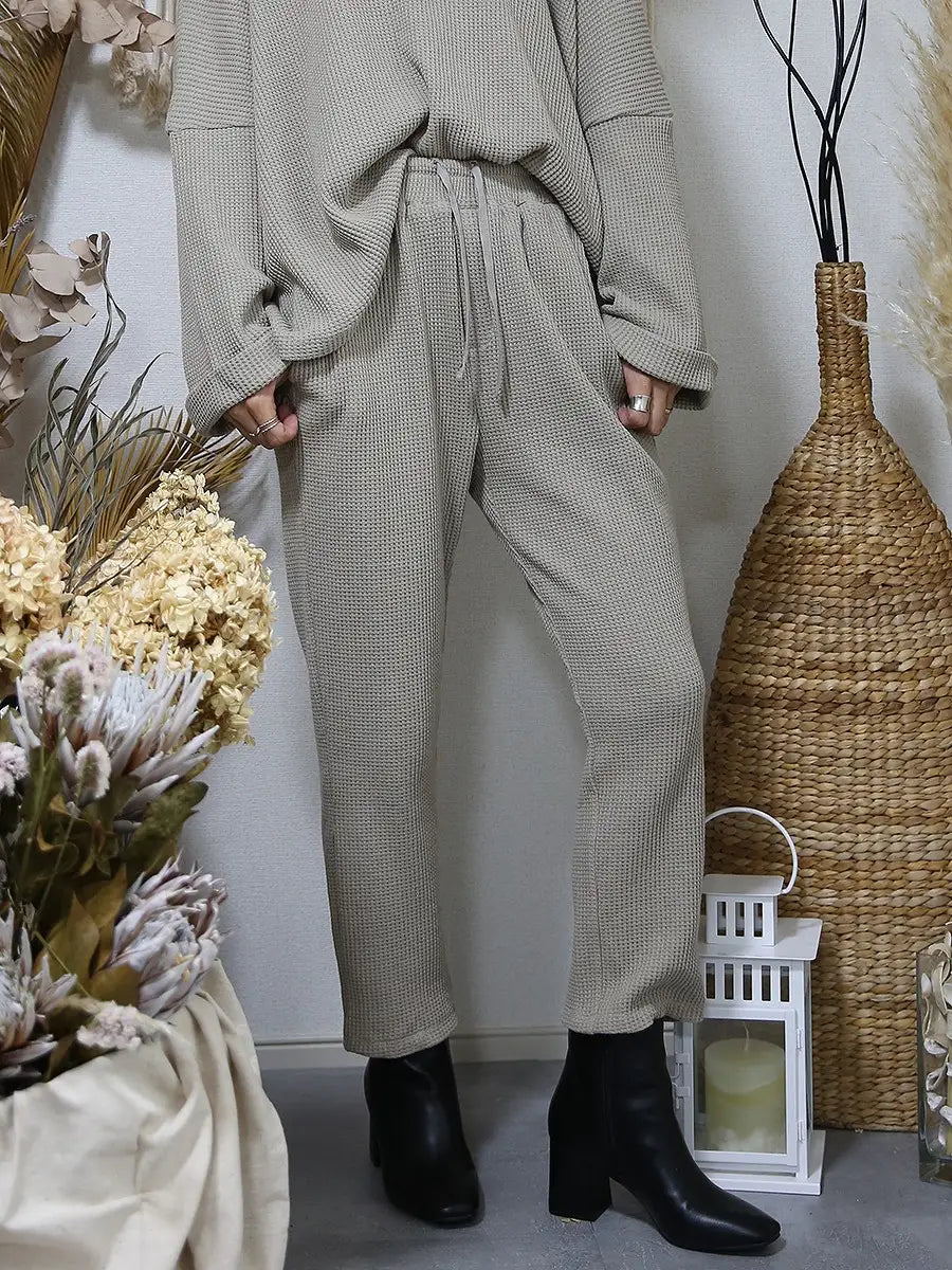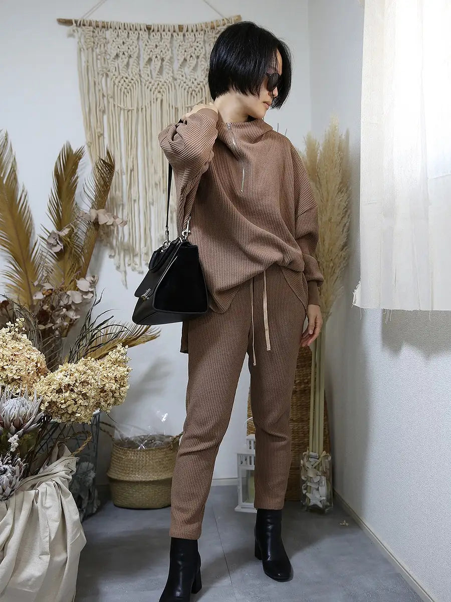 ワッフル生地のトップスやワッフル生地のハイネックパーカーと合わせて、セットアップコーデがおすすめです。