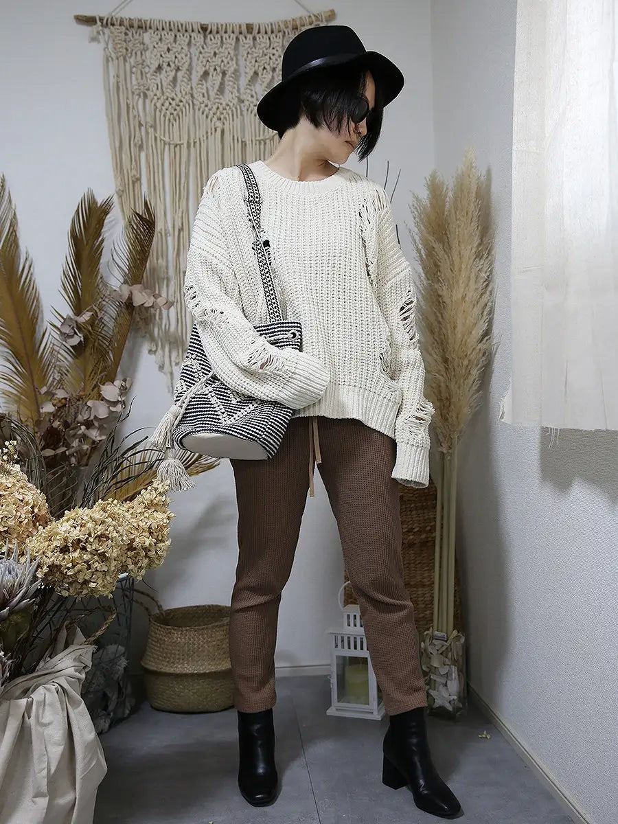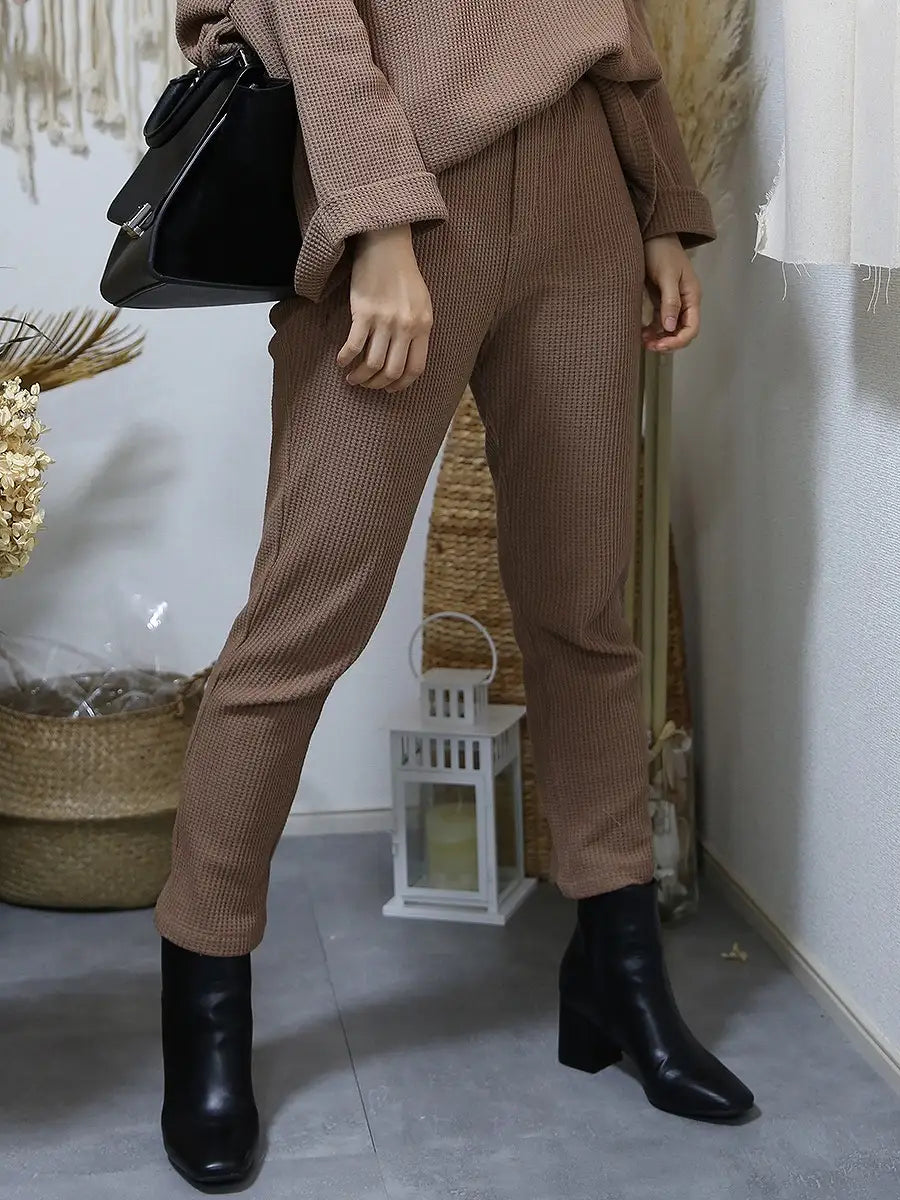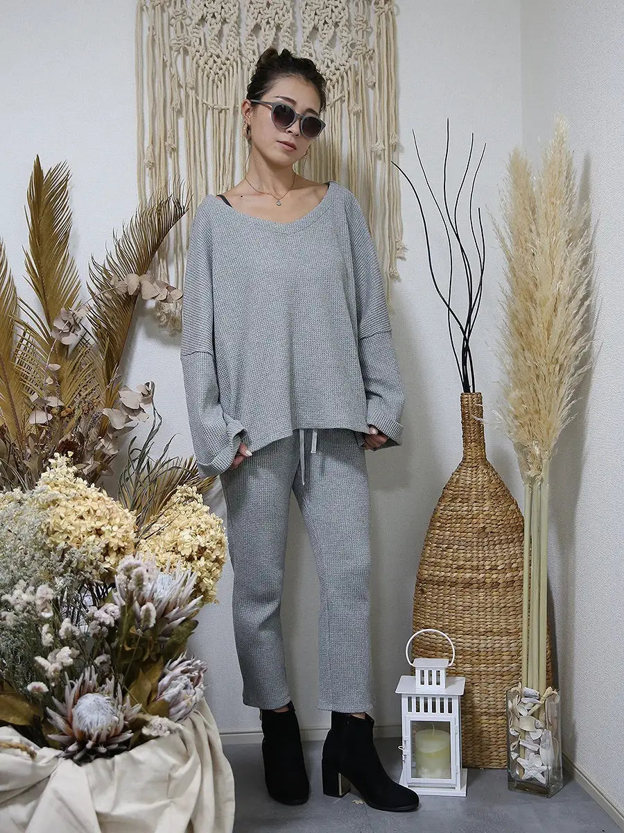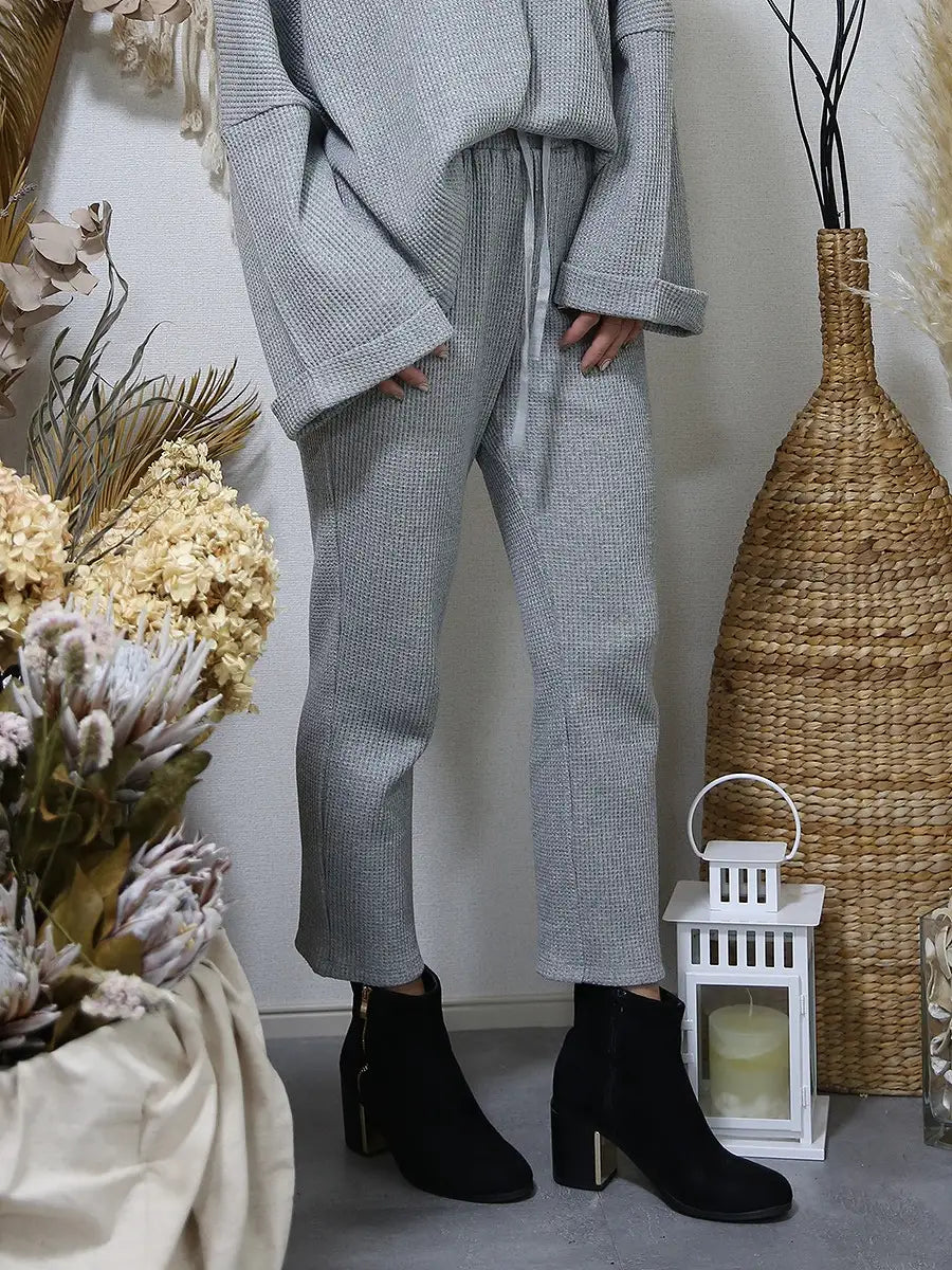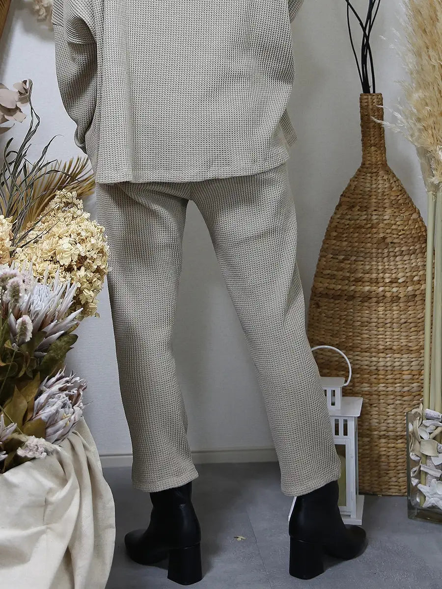 ワッフル生地のトップスやワッフル生地のハイネックパーカーと合わせて、セットアップコーデがおすすめです。
