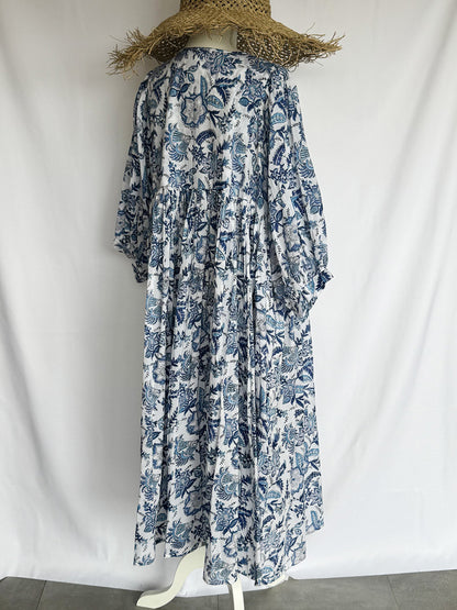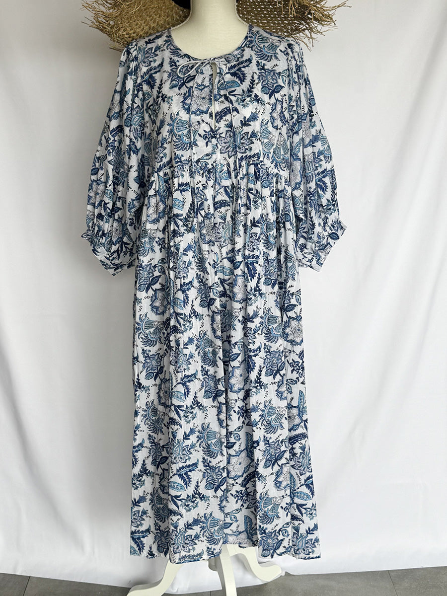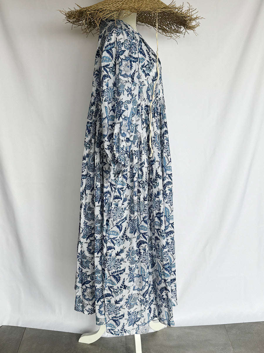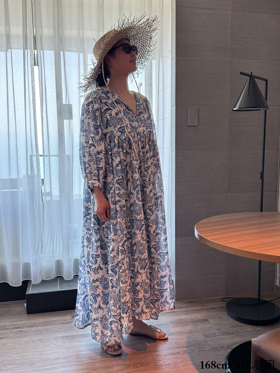 Eighty Seven(エイティセブン)インド綿フレア長袖ワンピース/ブルー花柄