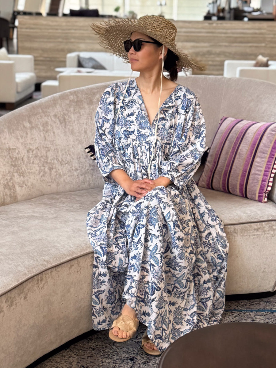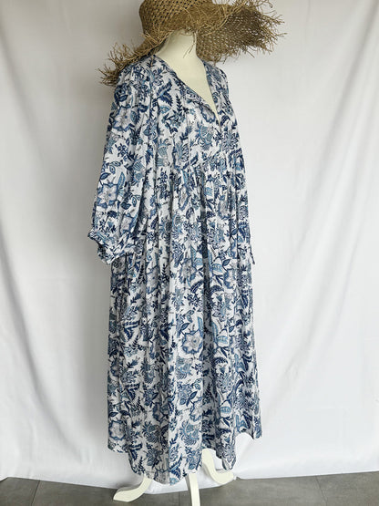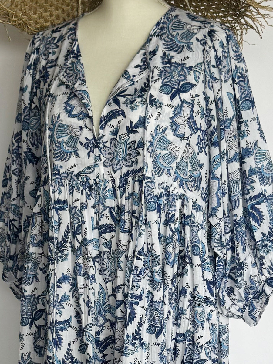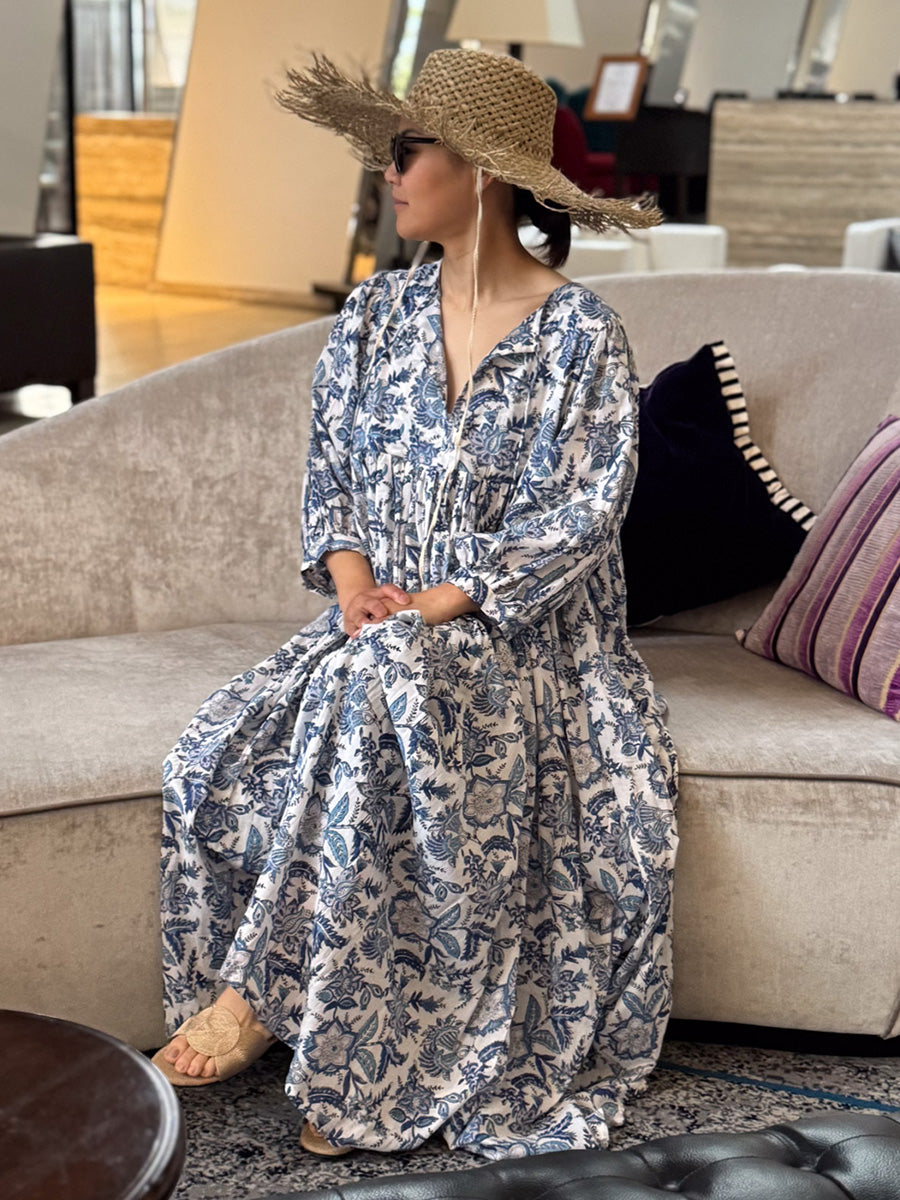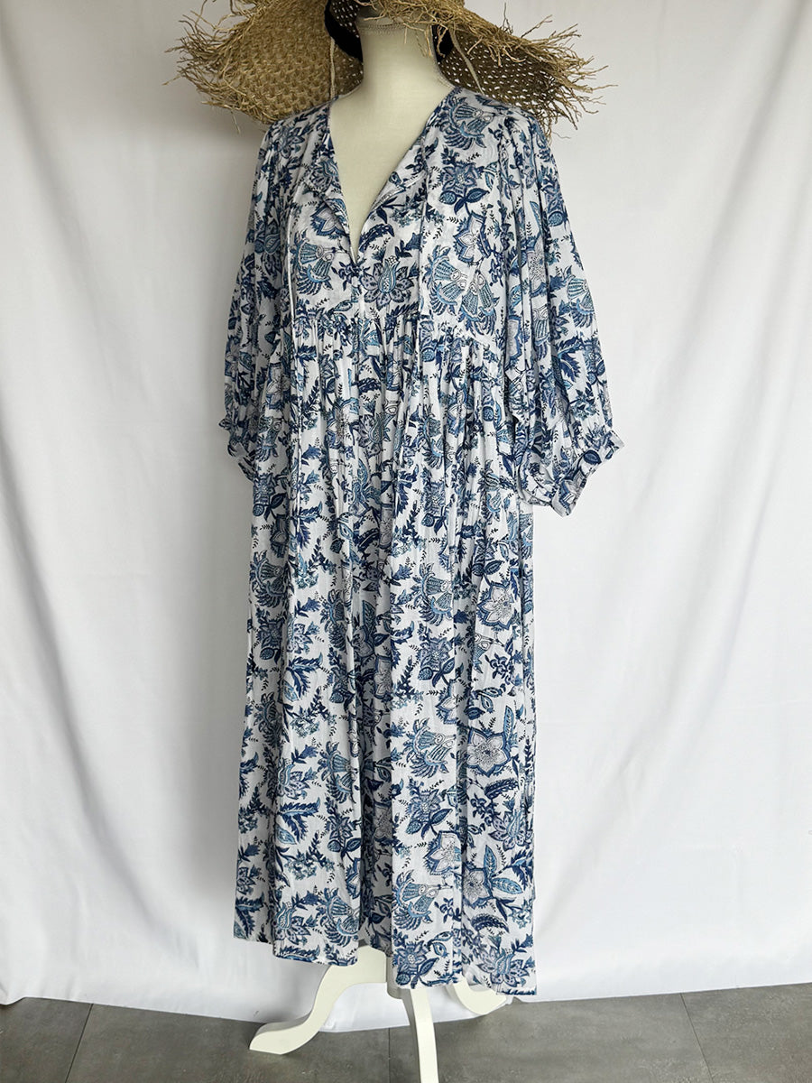 Eighty Seven(エイティセブン)インド綿フレア長袖ワンピース/ブルー花柄
