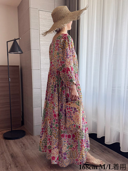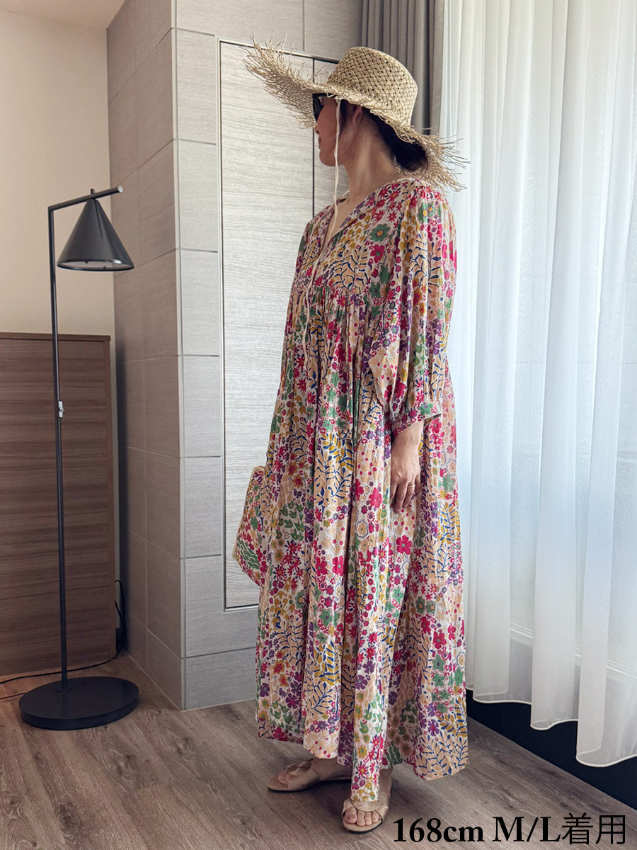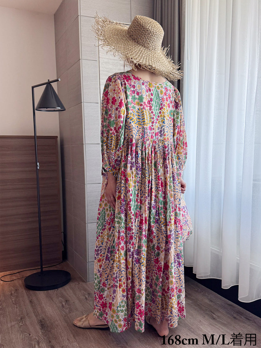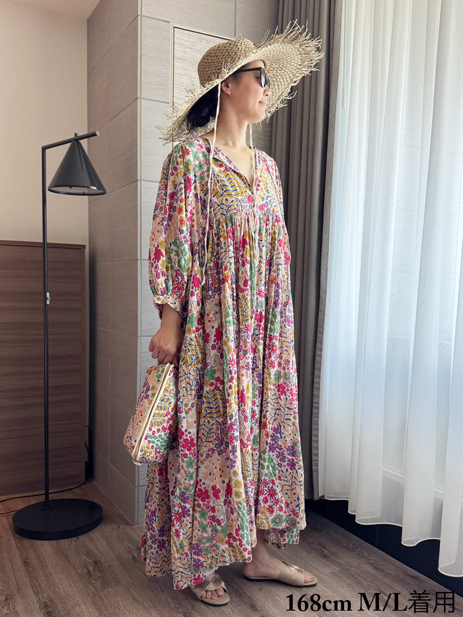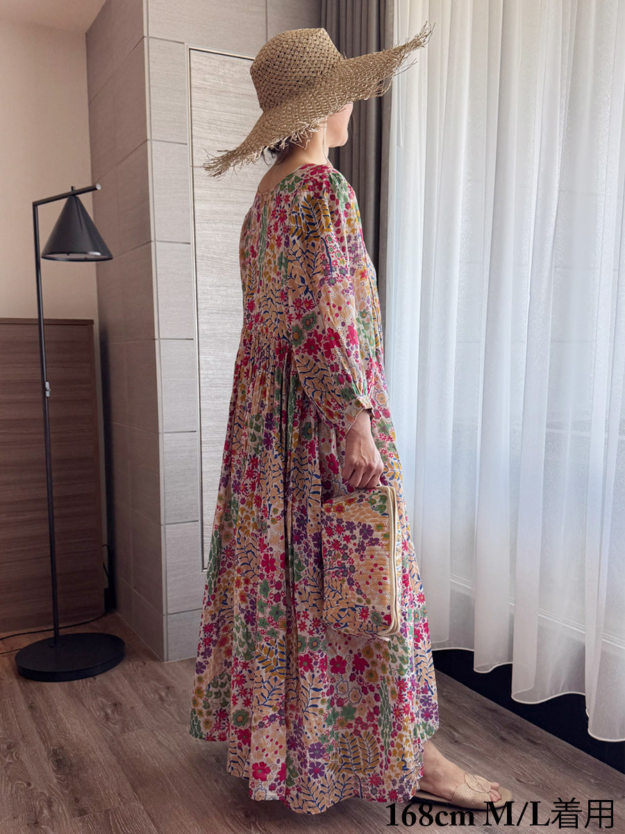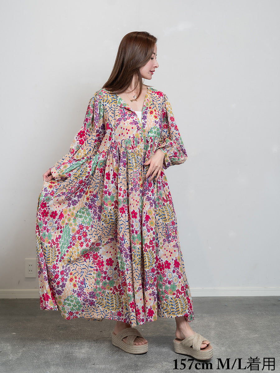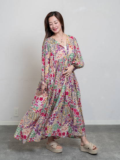 Eighty Seven(エイティセブン)インド綿フレア長袖ワンピース/カラフル花柄