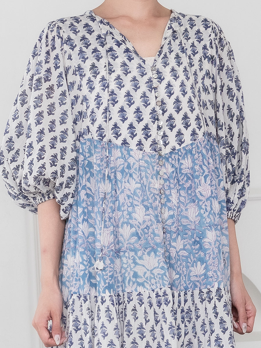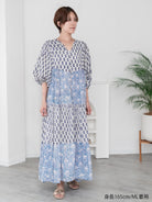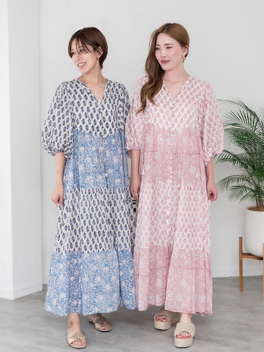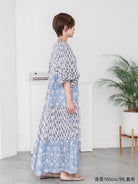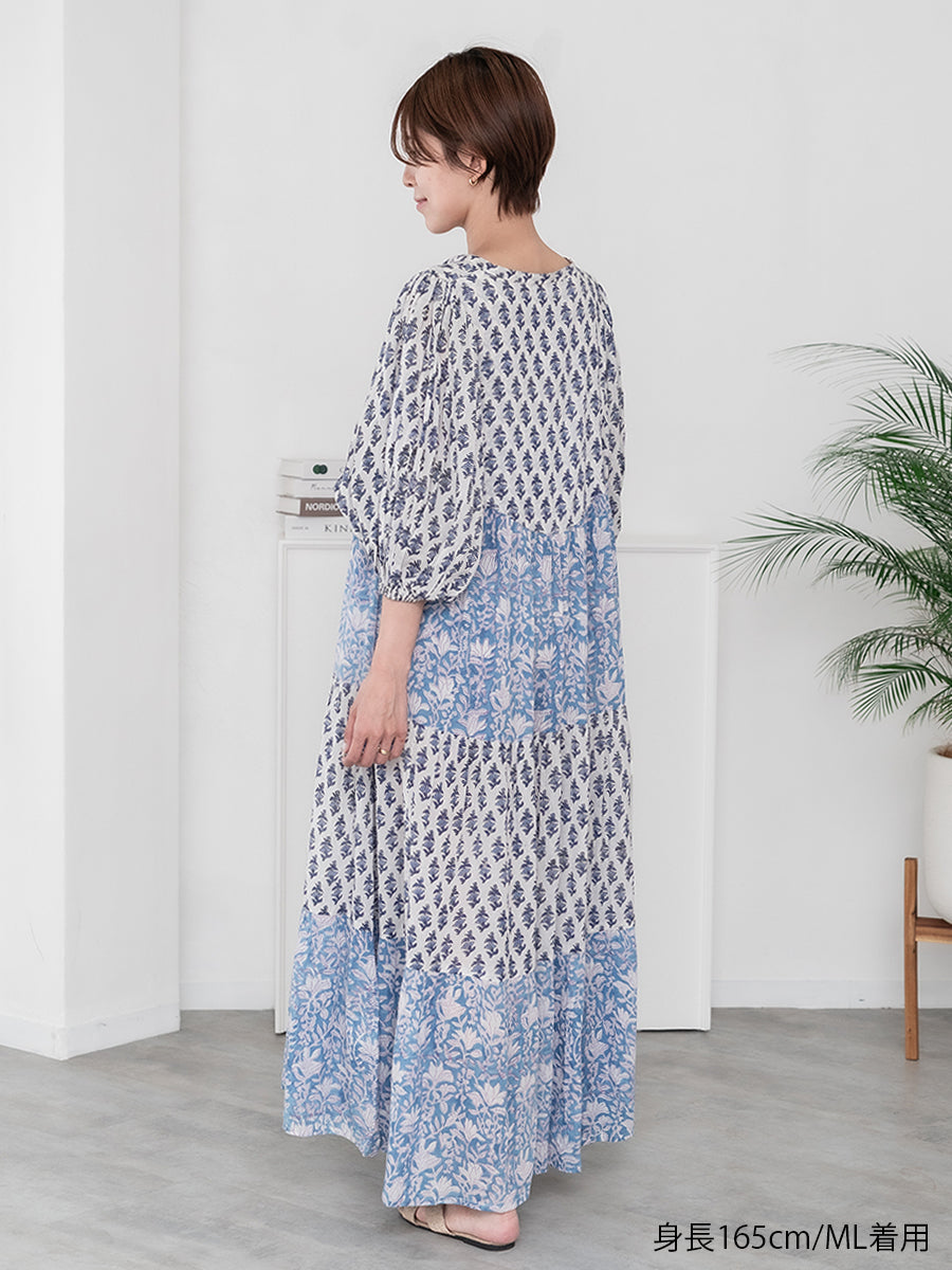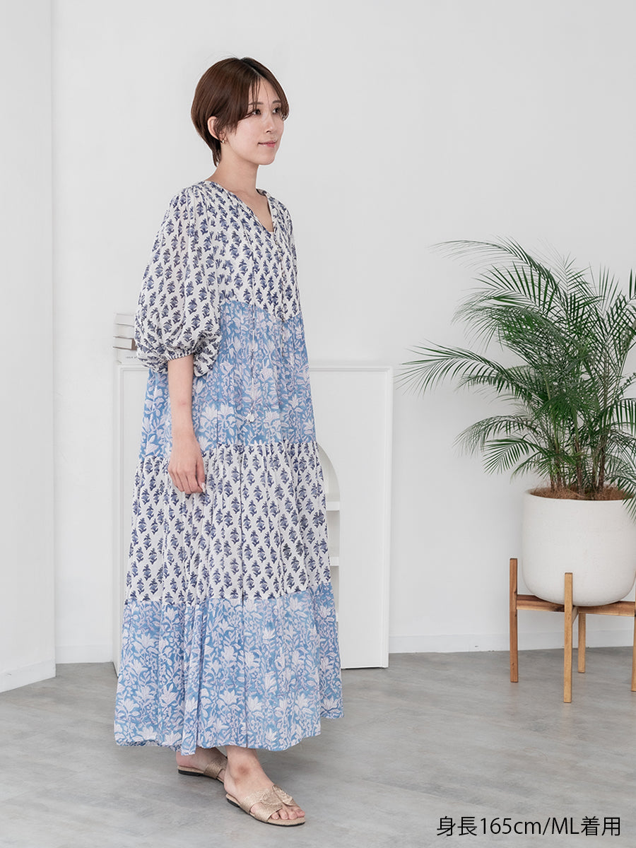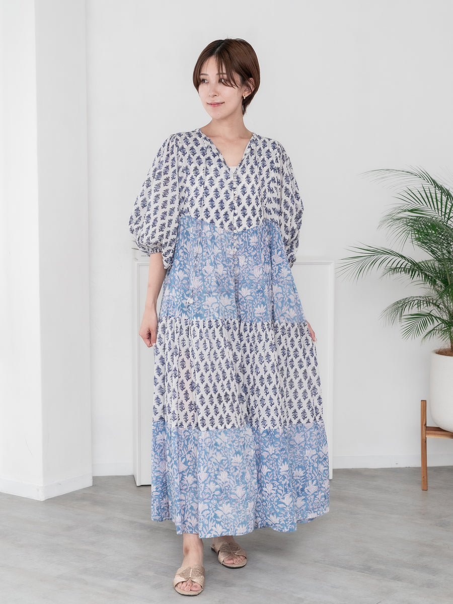 Eighty Seven(エイティセブン)インド綿フレア前ボタン切替ワンピース/ブルー