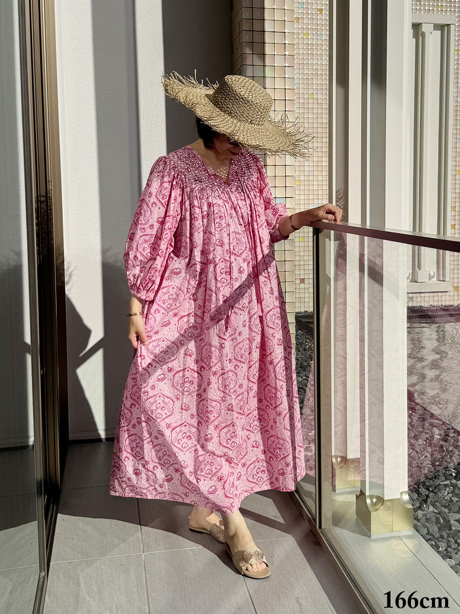 可愛いピンク生地にオリエンタル柄のブロックプリントされたワンピース。