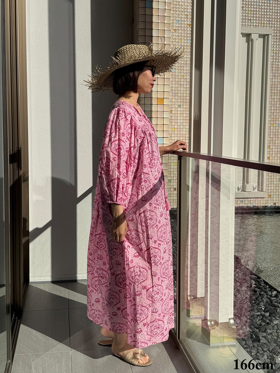 Eighty Seven(エイティセブン)インド綿フレア長袖ワンピース/ピンクオリエンタル柄
