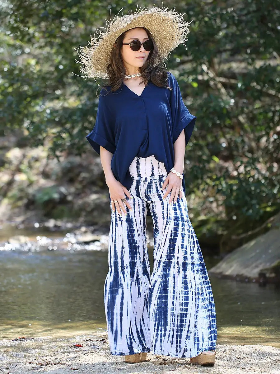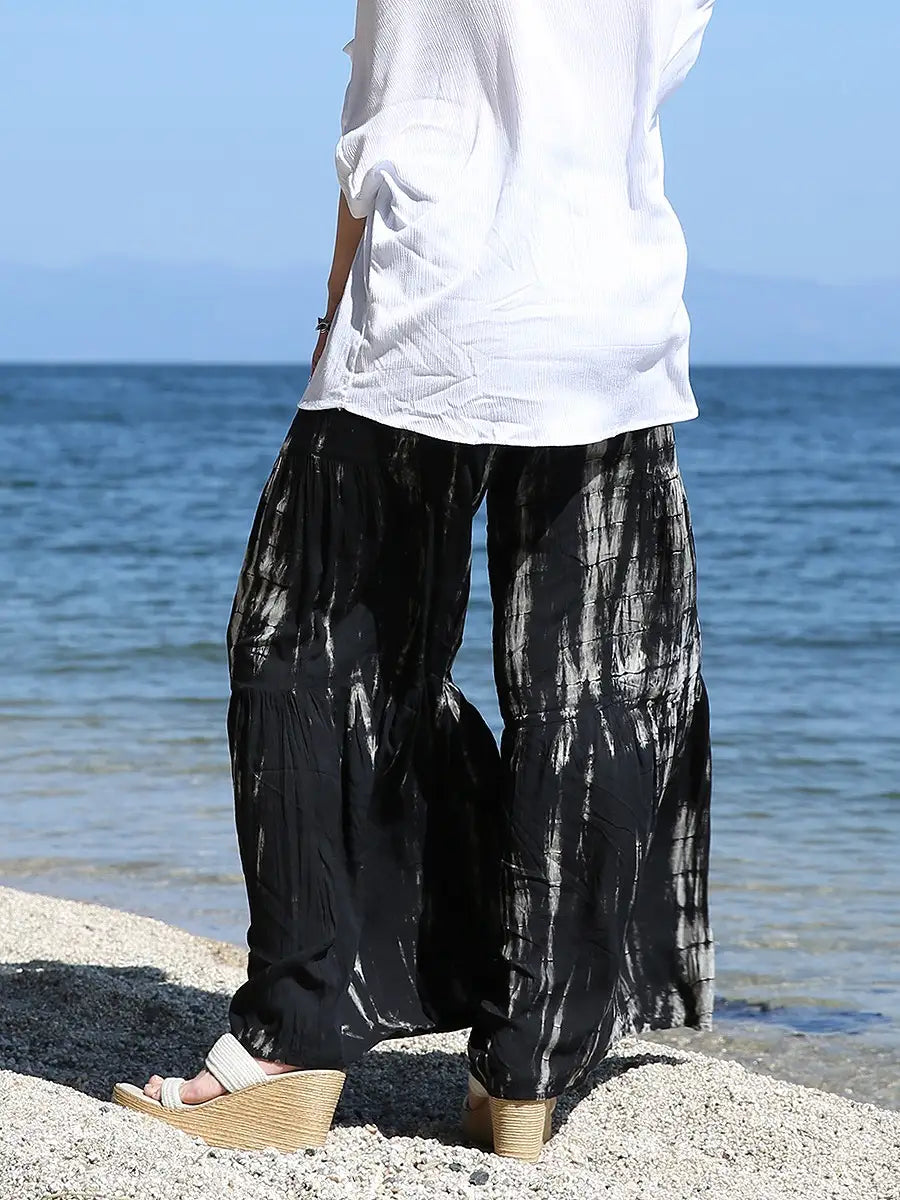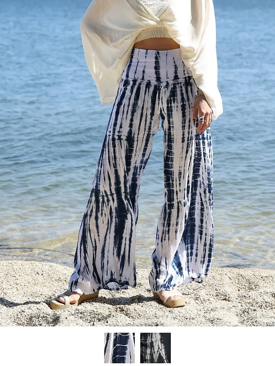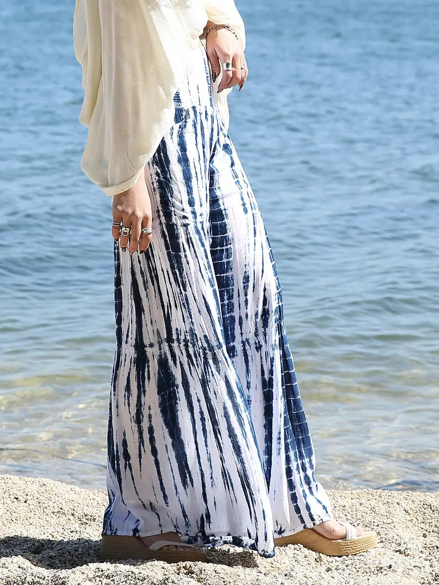 ビーチ・リゾートシーンで映えるタイダイ柄のワイドパンツです。