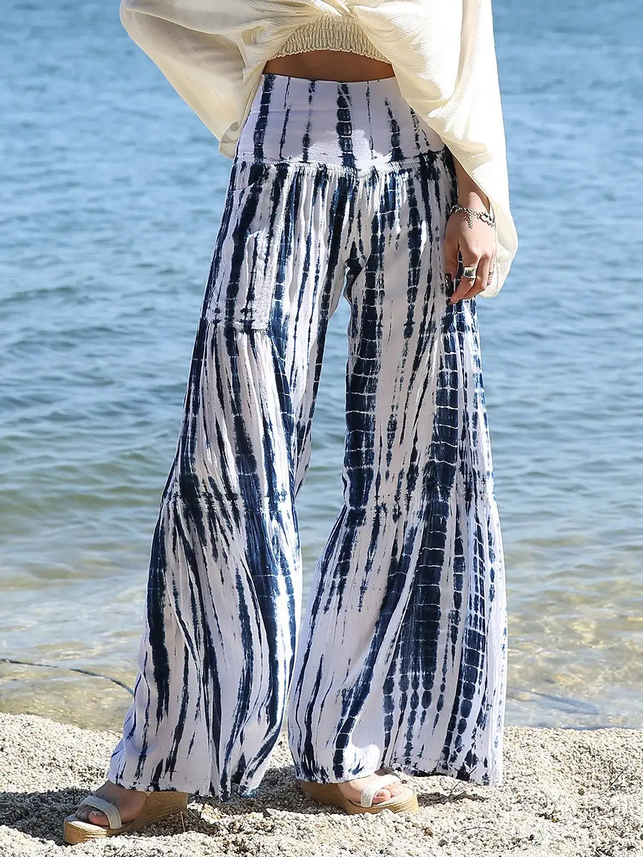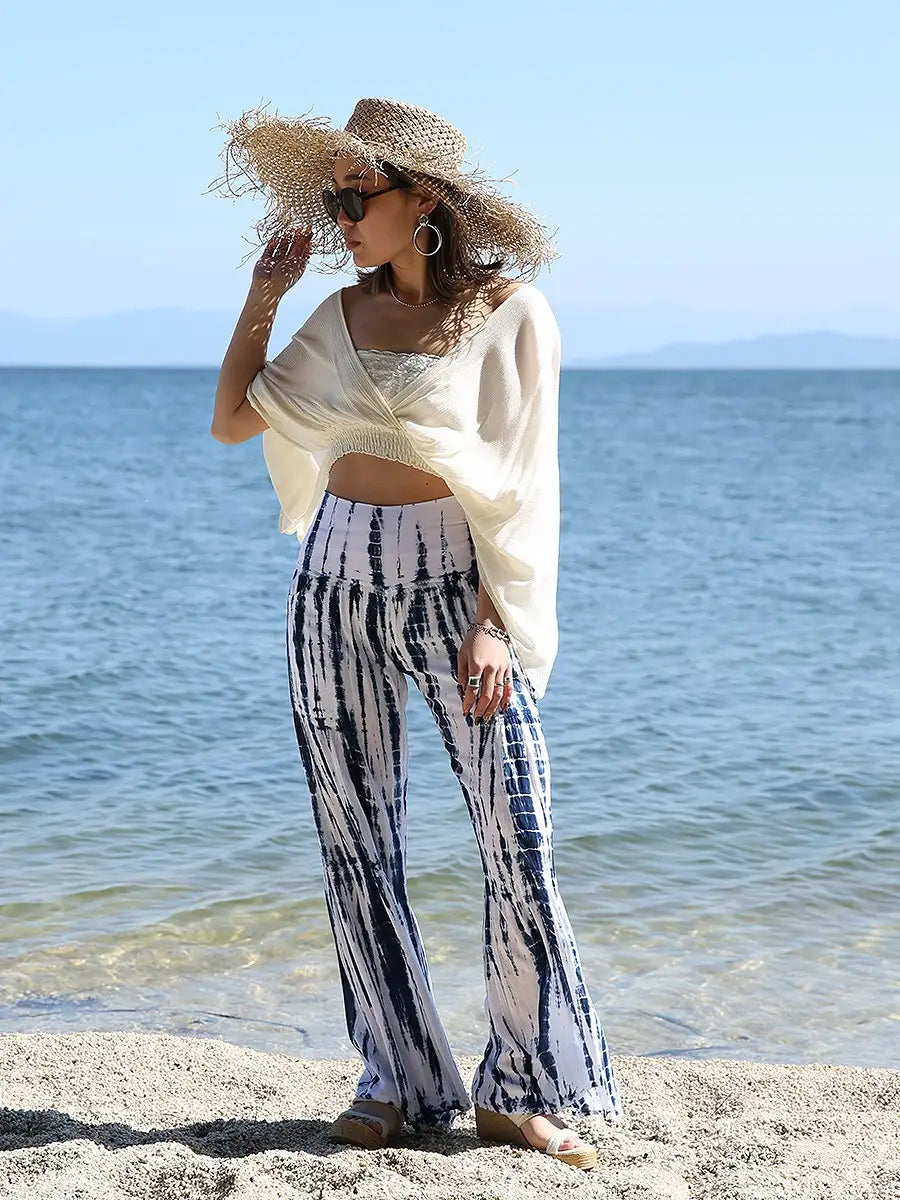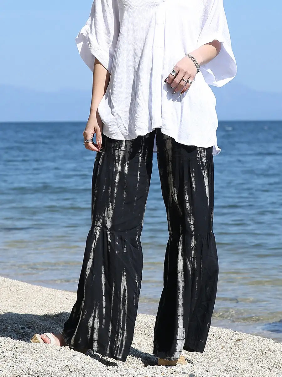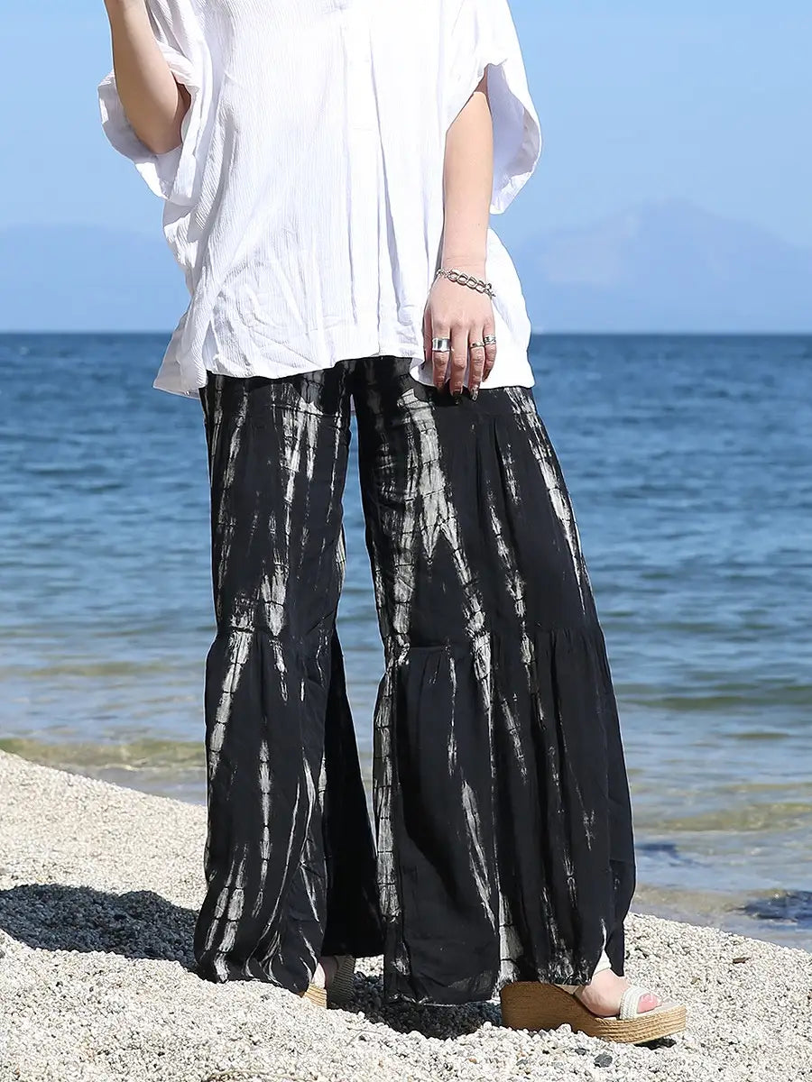 ビーチ・リゾートシーンで映えるタイダイ柄のワイドパンツです。