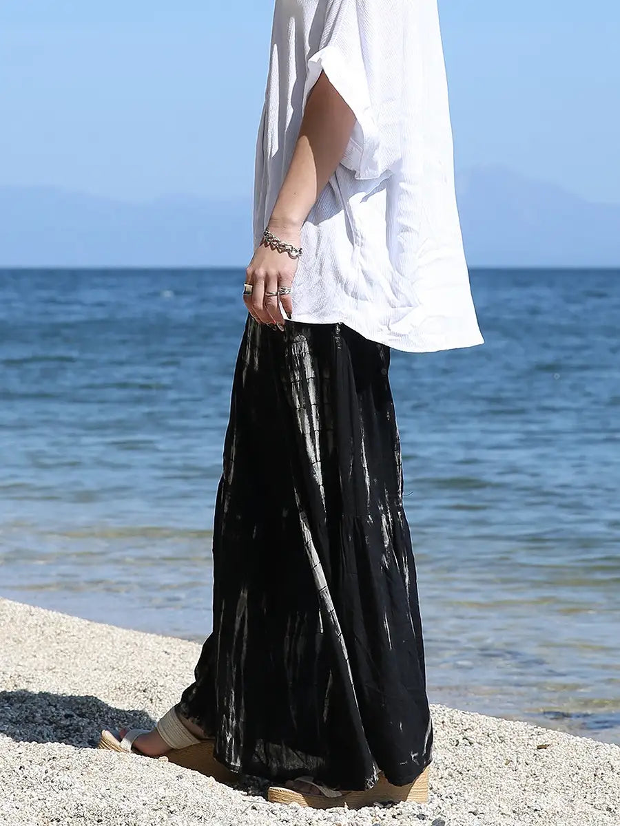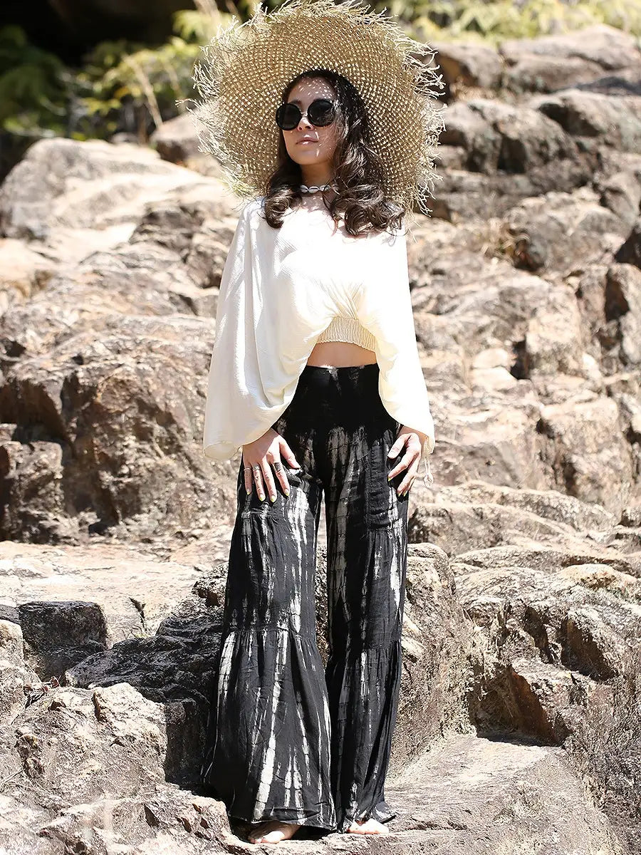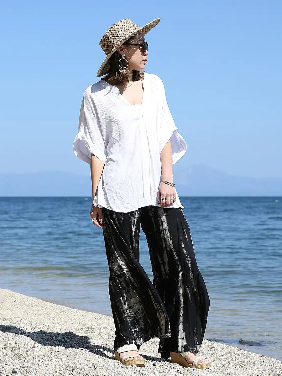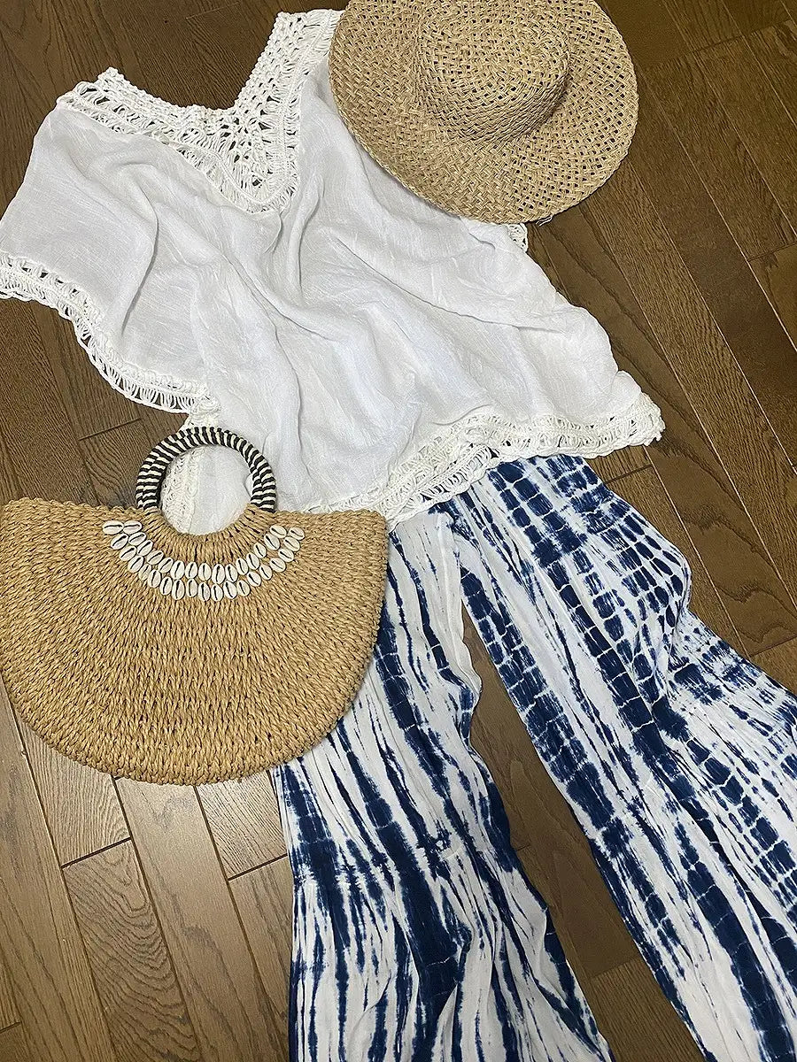 ビーチ・リゾートシーンで映えるタイダイ柄のワイドパンツです。