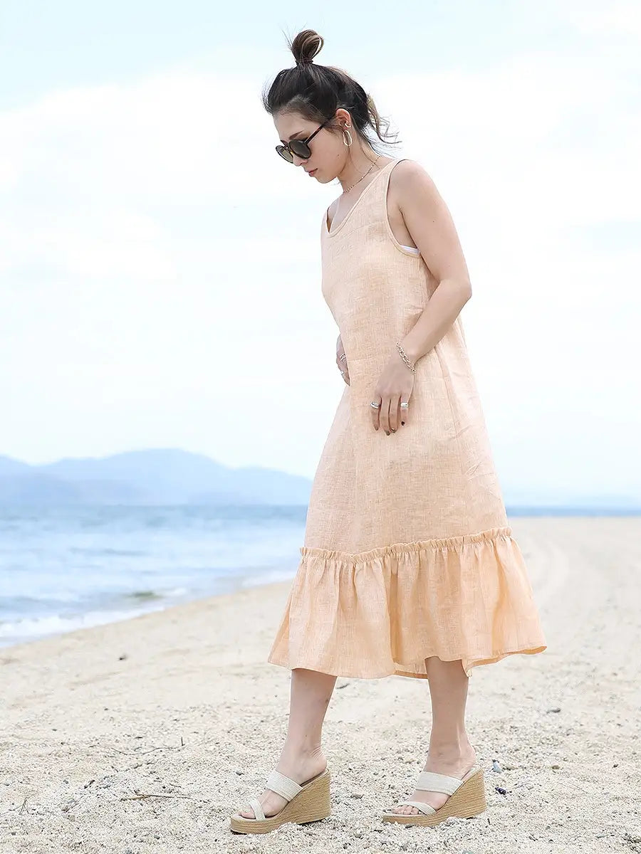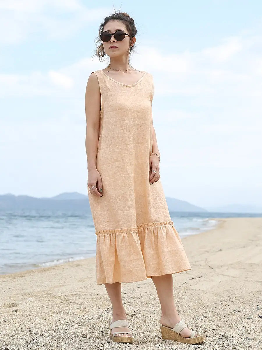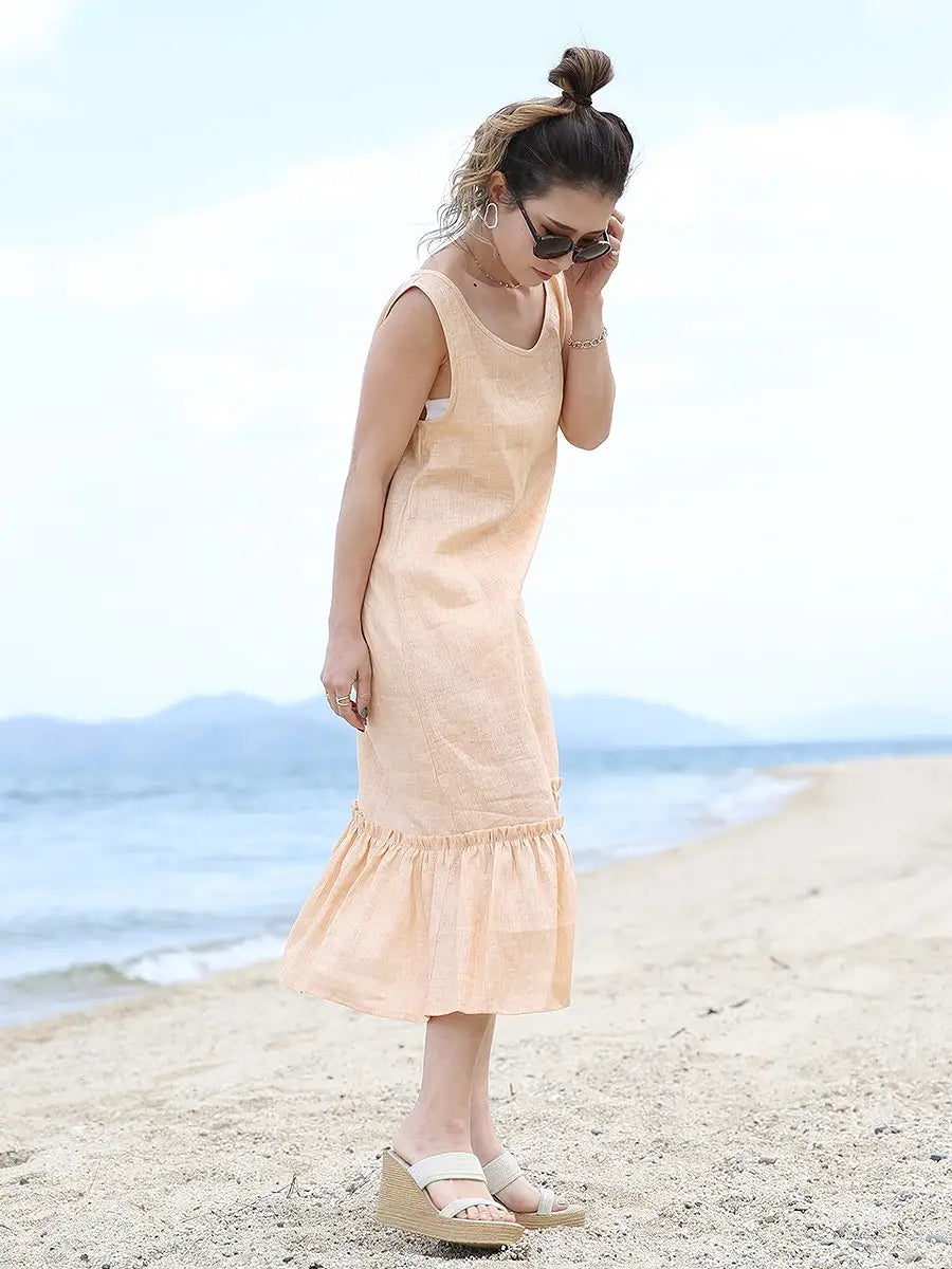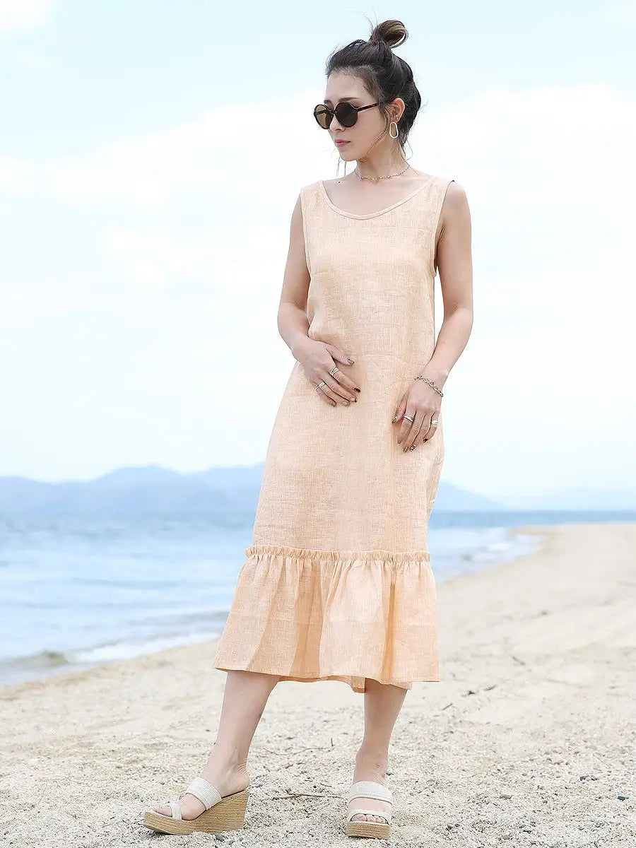 ノースリーブデザインで、裾のフリルが可愛いリネンワンピース