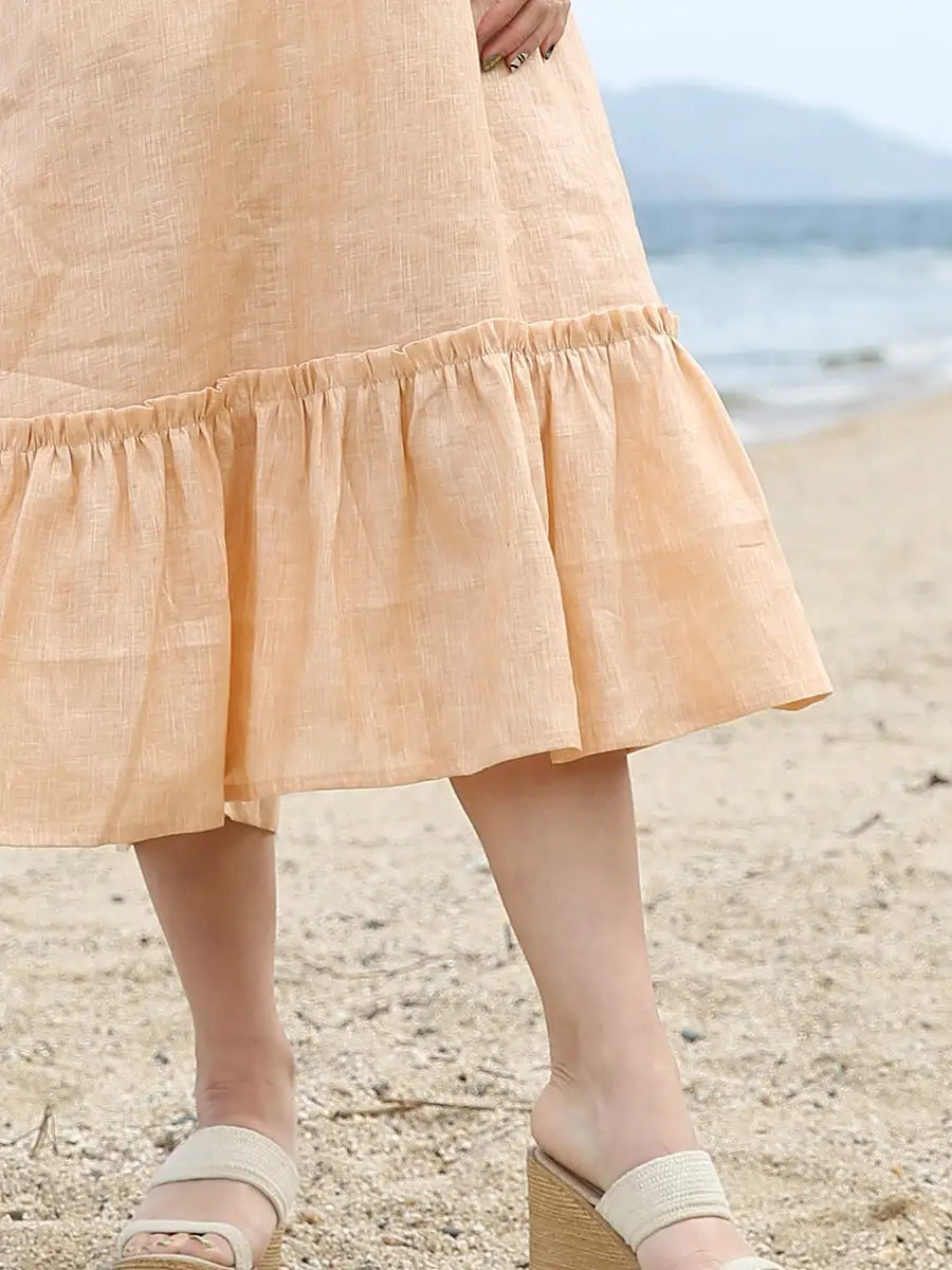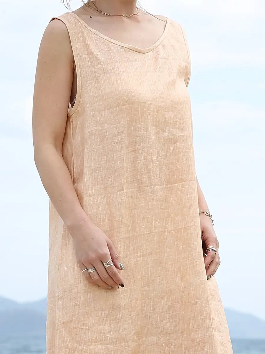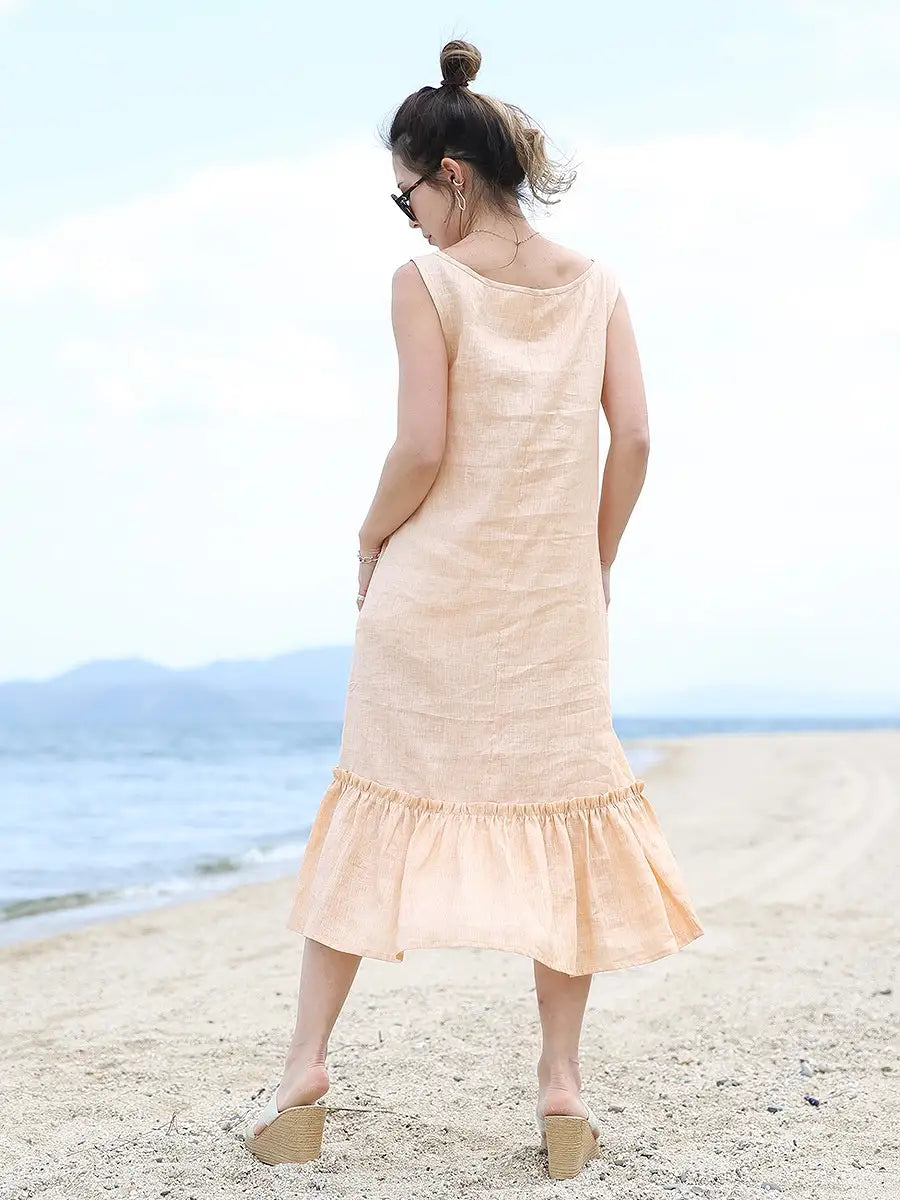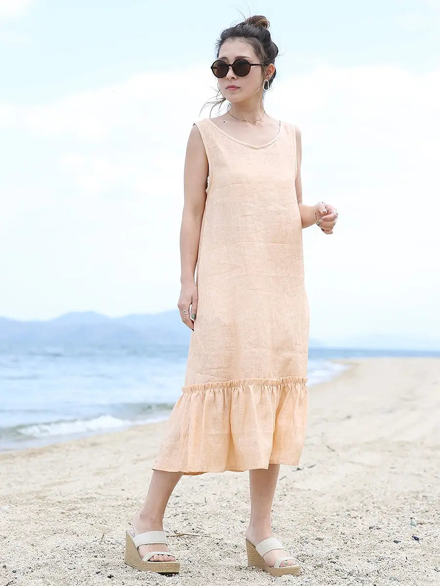 ノースリーブデザインで、裾のフリルが可愛いリネンワンピース