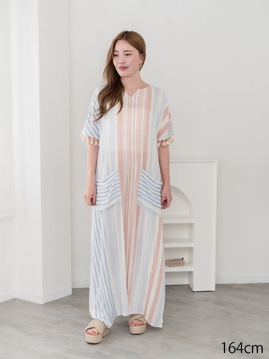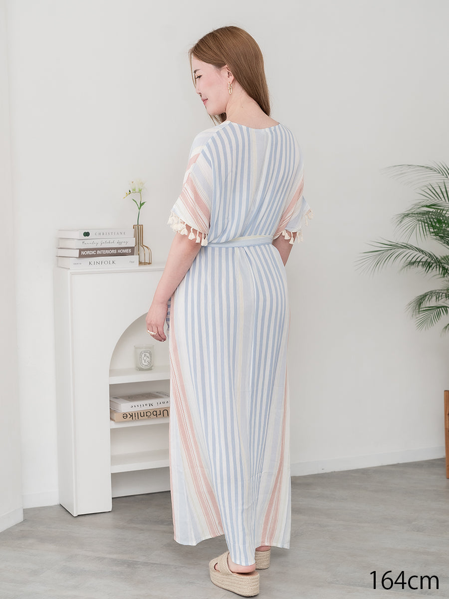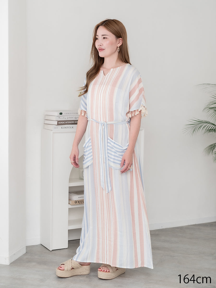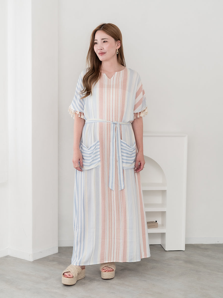 roomy by the sea(ルーミーバイザシー)大人ストライプ袖タッセルマキシワンピース