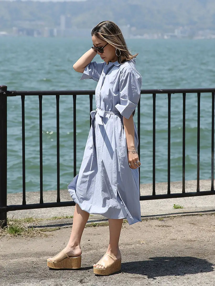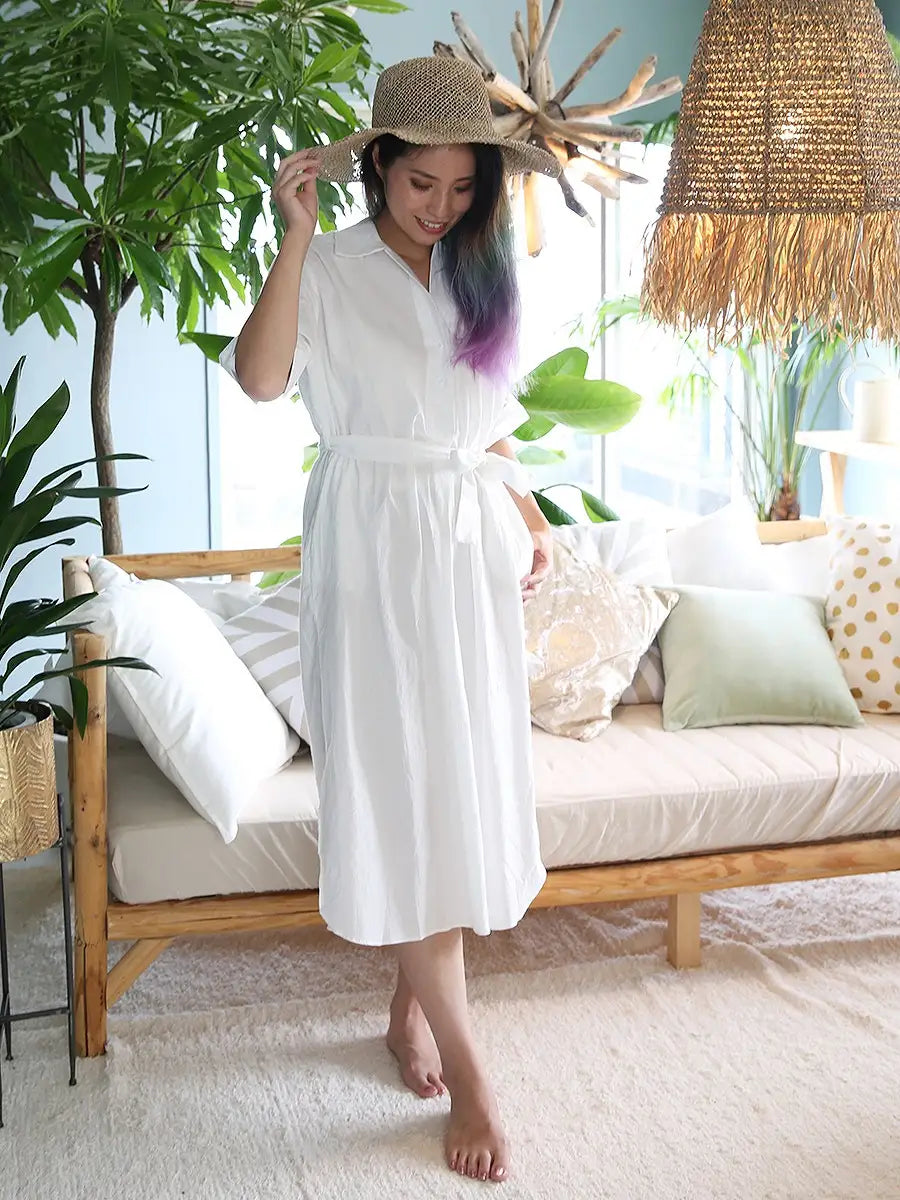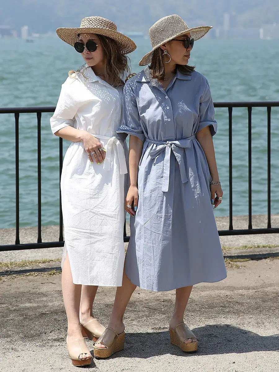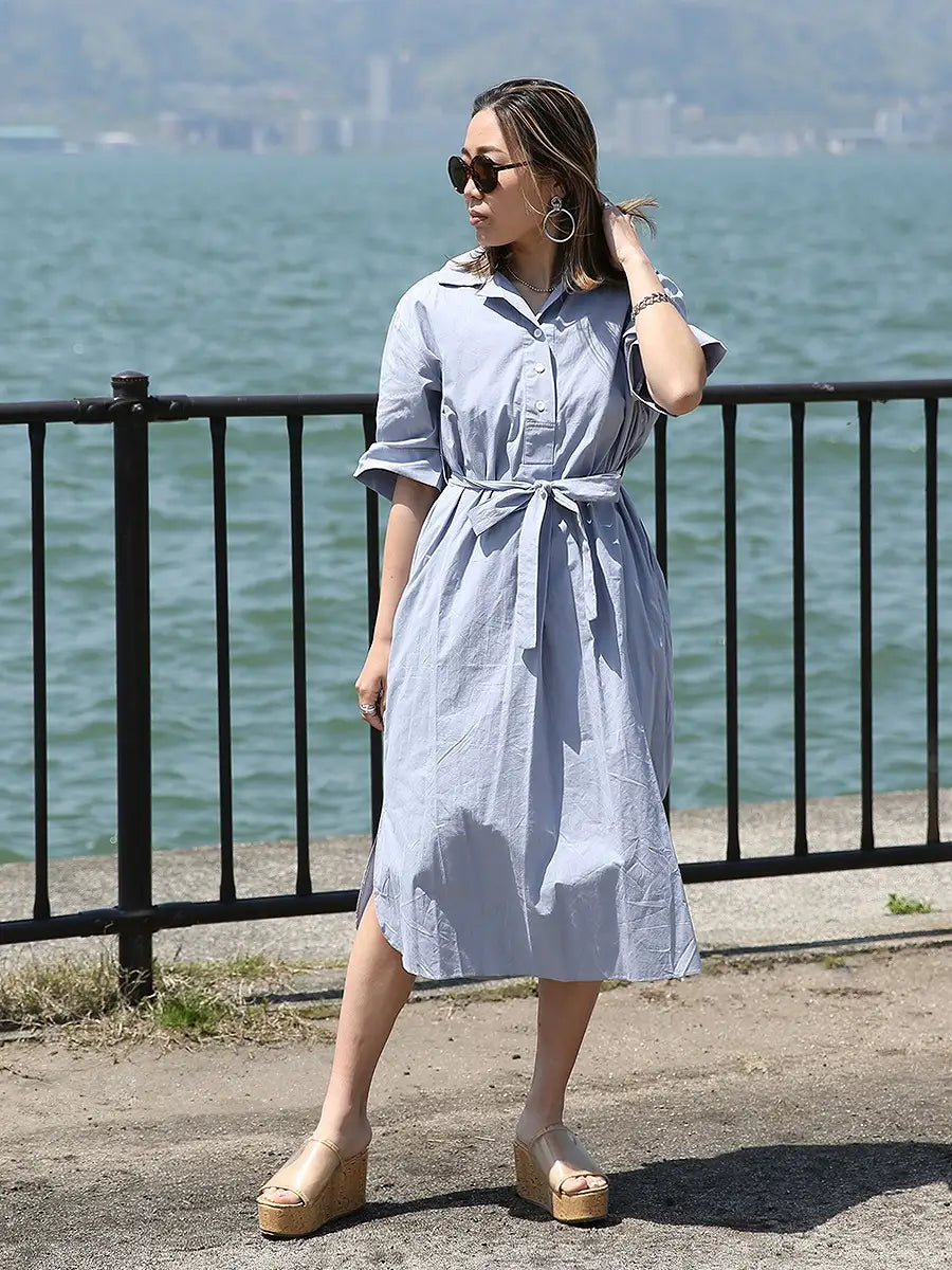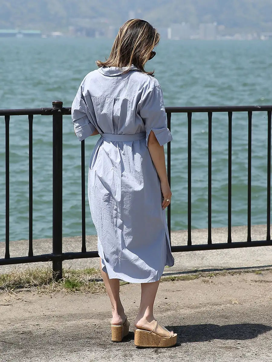 roomy by the sea(ルーミーバイザシー)ベーシック五分袖シャツワンピース。