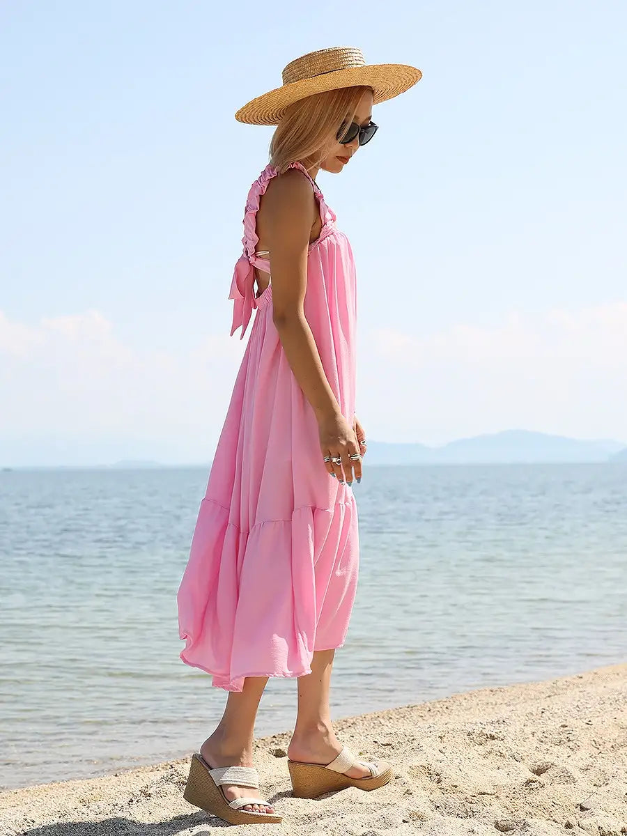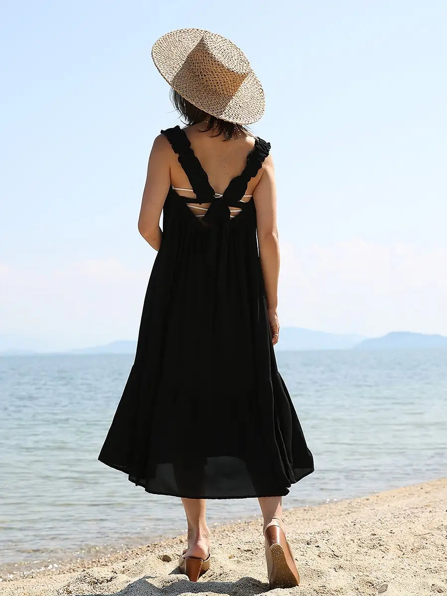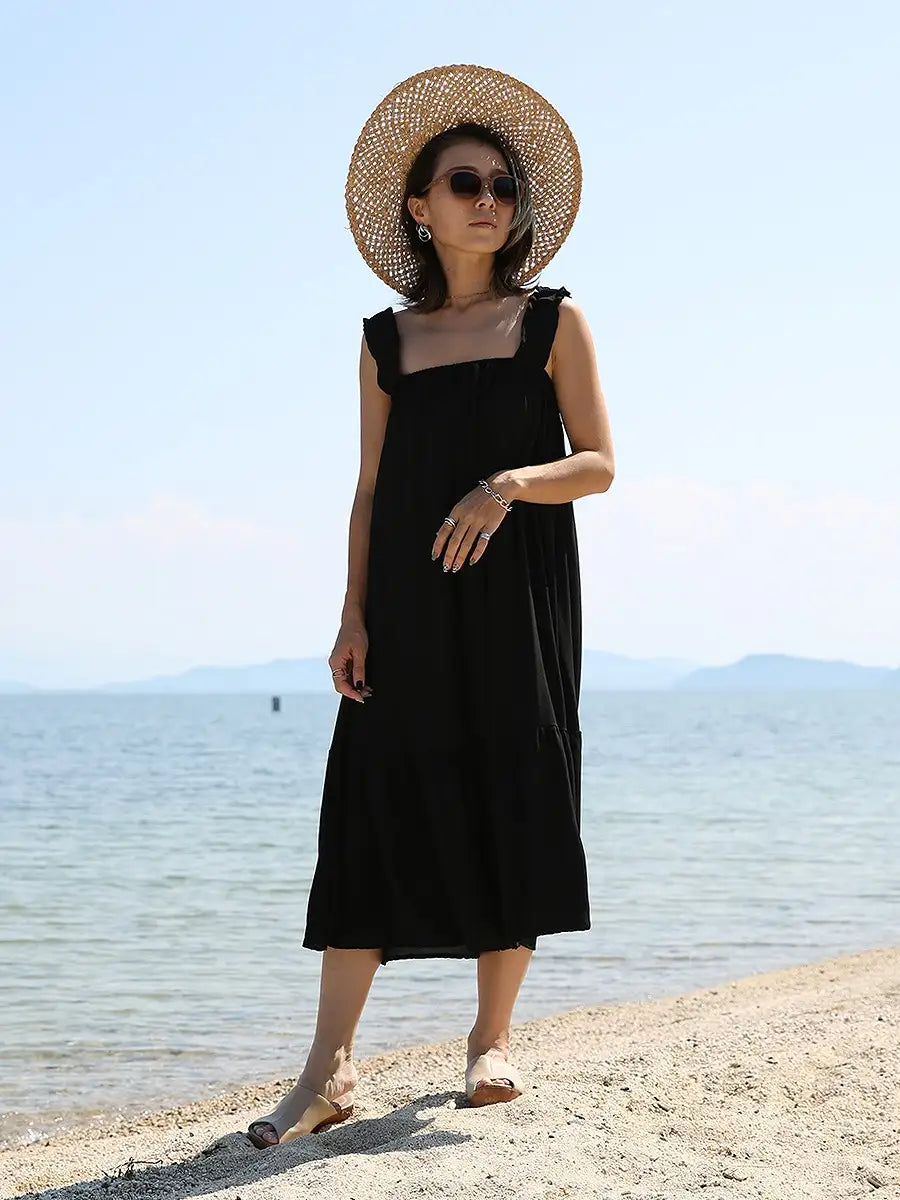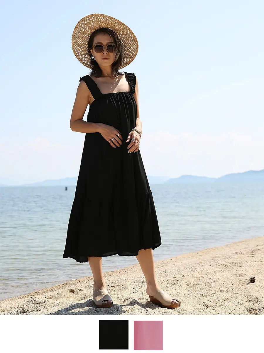 肩紐、背中のデザインがポイントのミモレ丈ワンピースです。