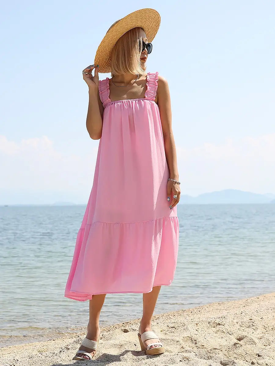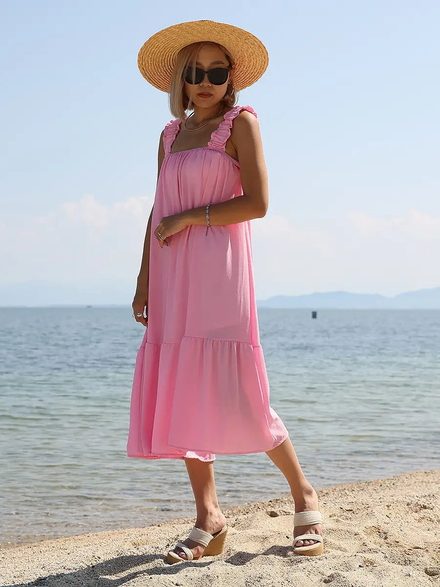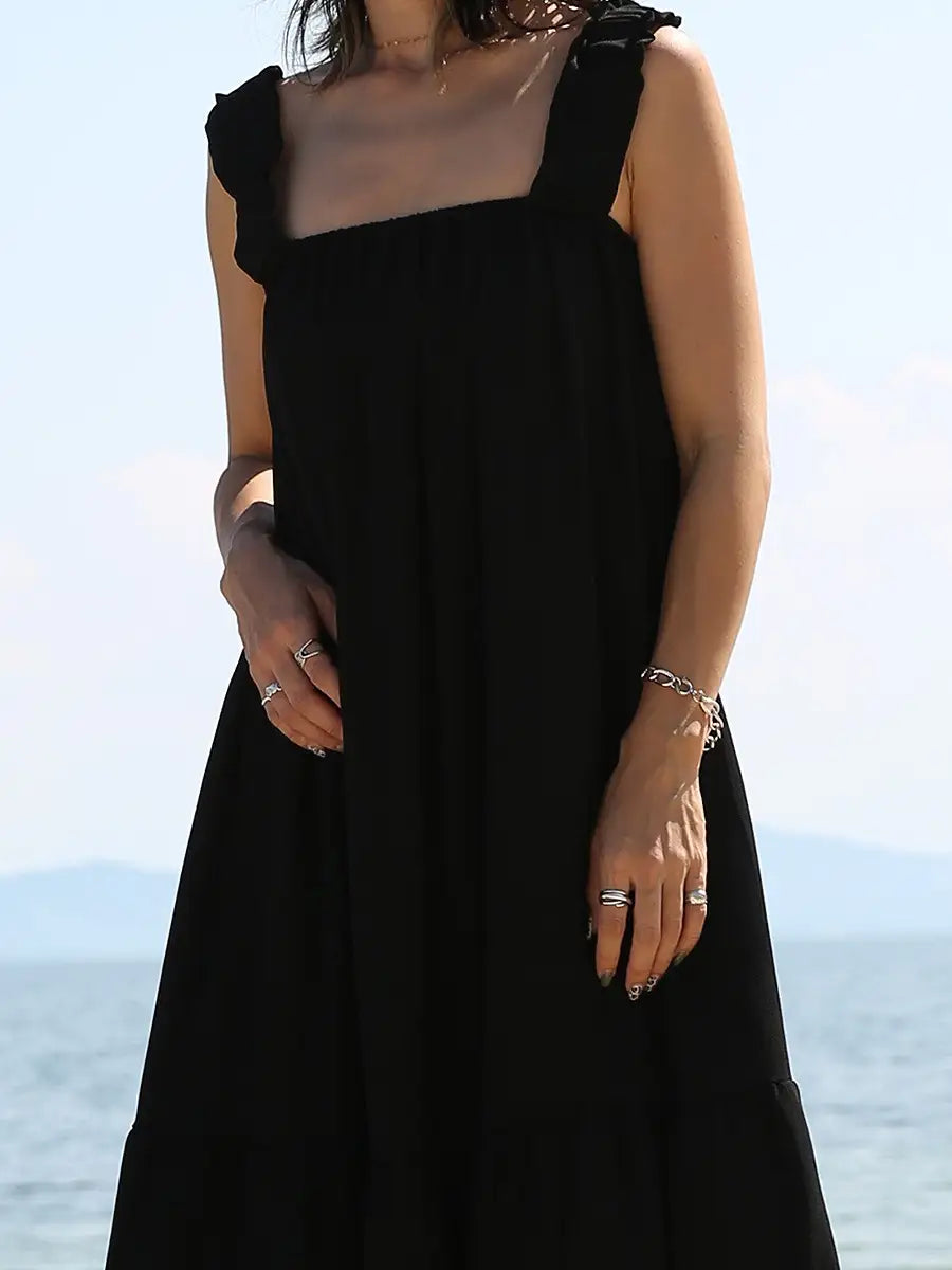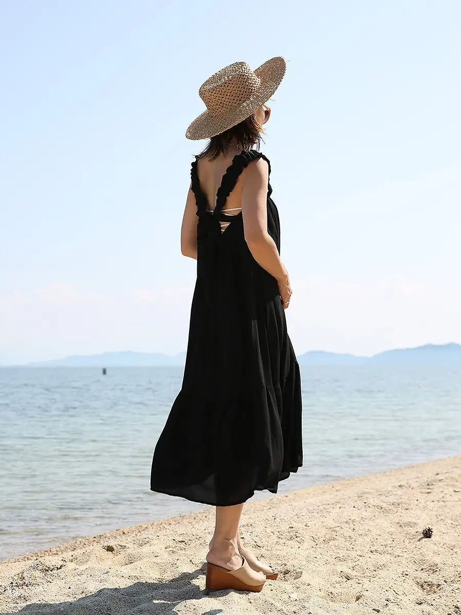 肩紐、背中のデザインがポイントのミモレ丈ワンピースです。