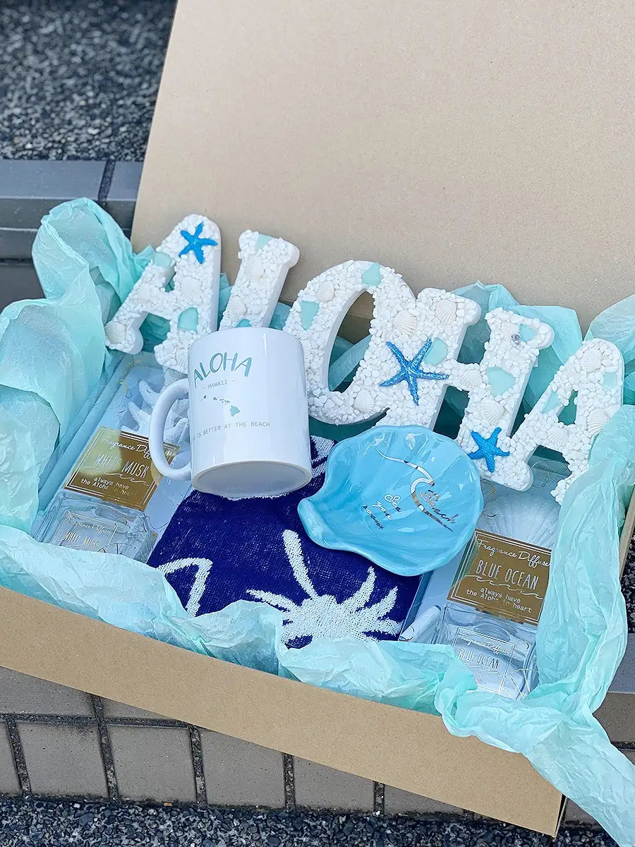 Alohaサインボード、Alohaフェイスタオル、Alohaマグカップ、シェルプレート、コーラルビーチシーディフューザー、シェルビーチシーディフューザーの合計6点が入っています。