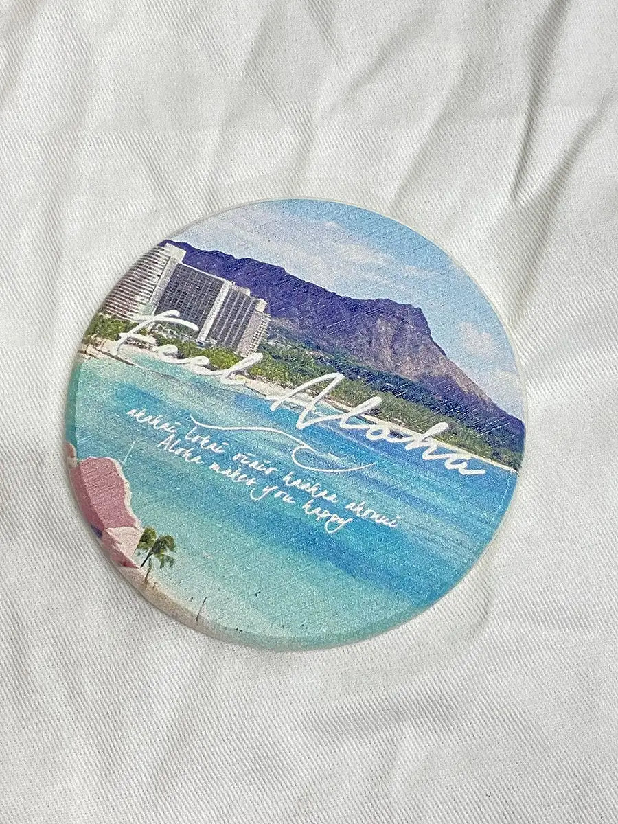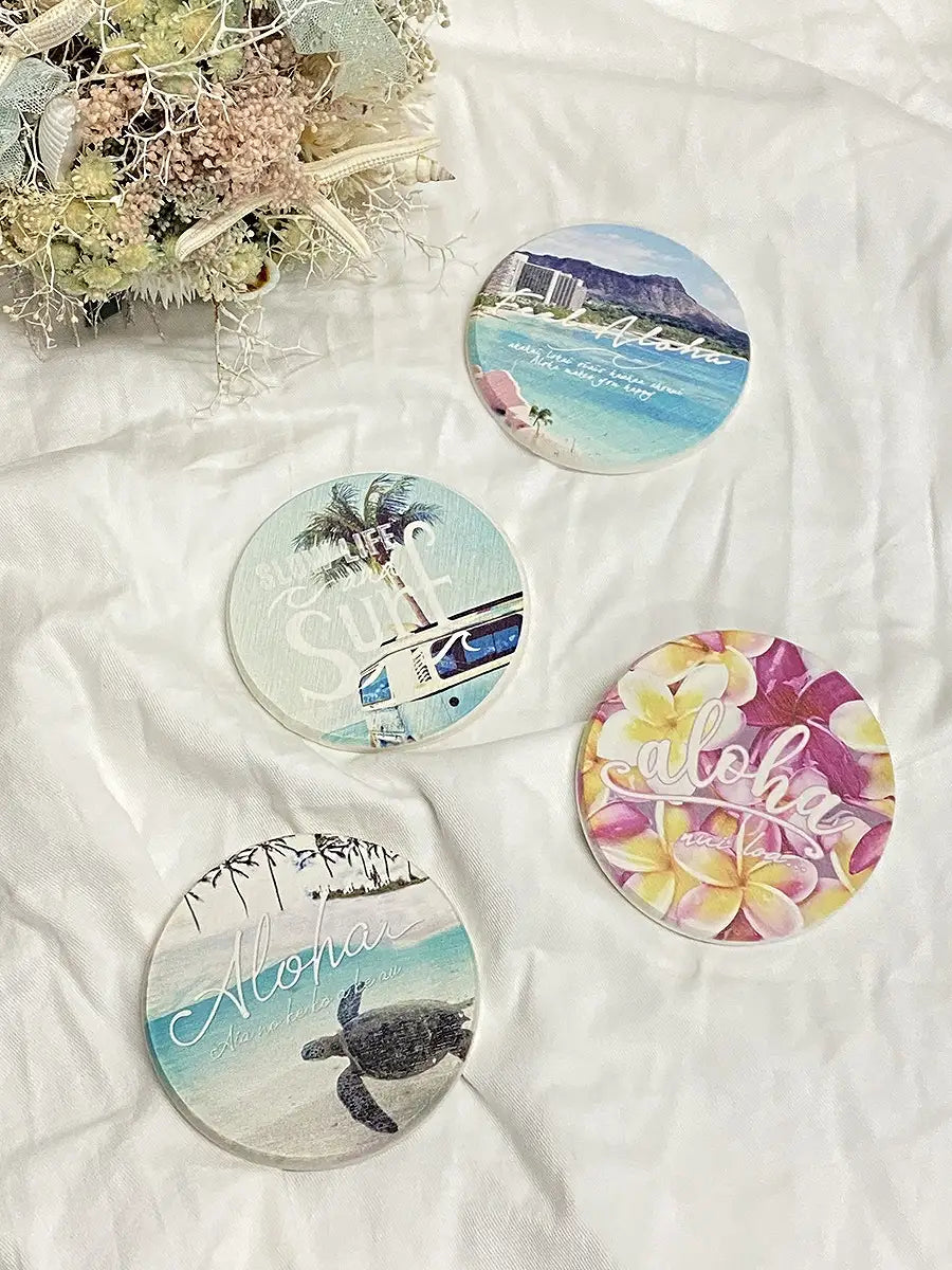 ハワイの風景がプリントされた、とっても可愛い珪藻土コースターです。