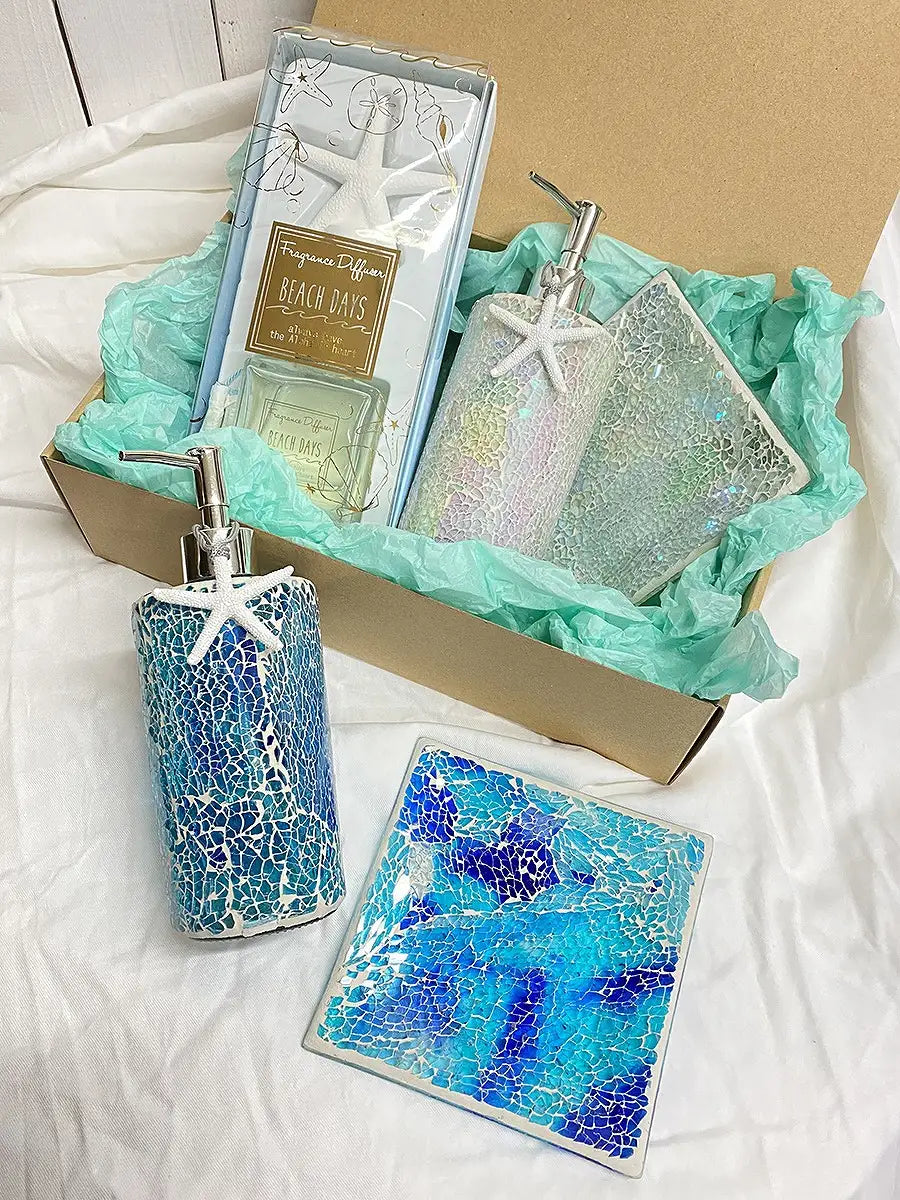 ビーチディフューザー、モザイクビーチタイルのディスペンサーとプレートの3点セットです。
