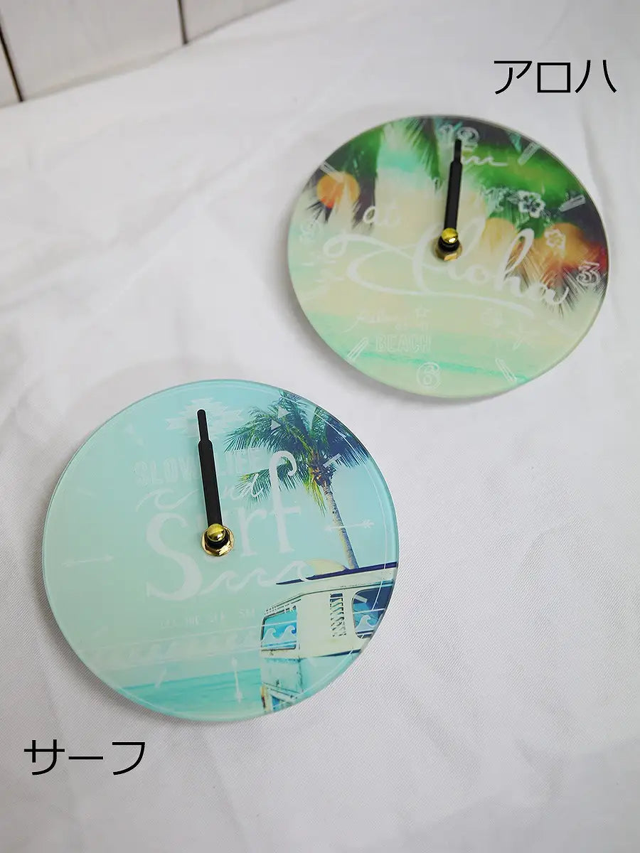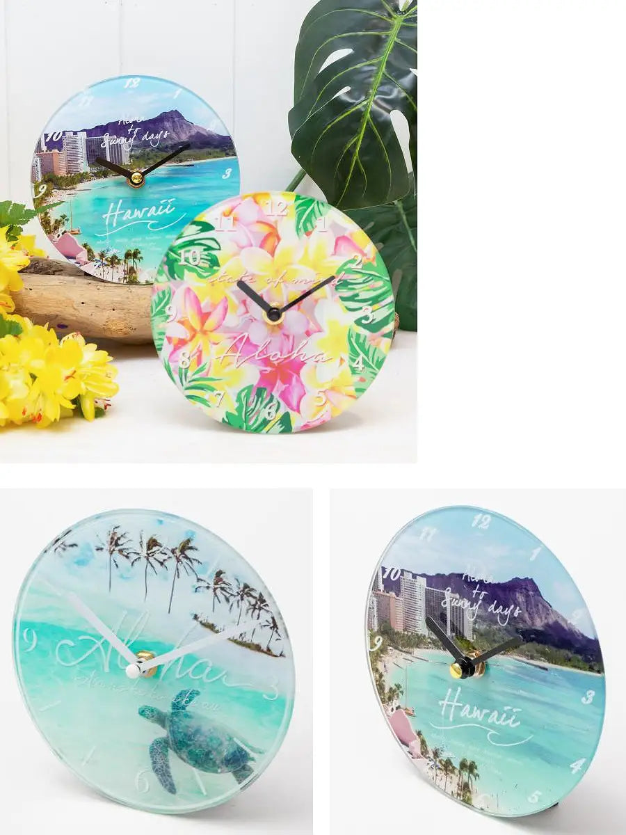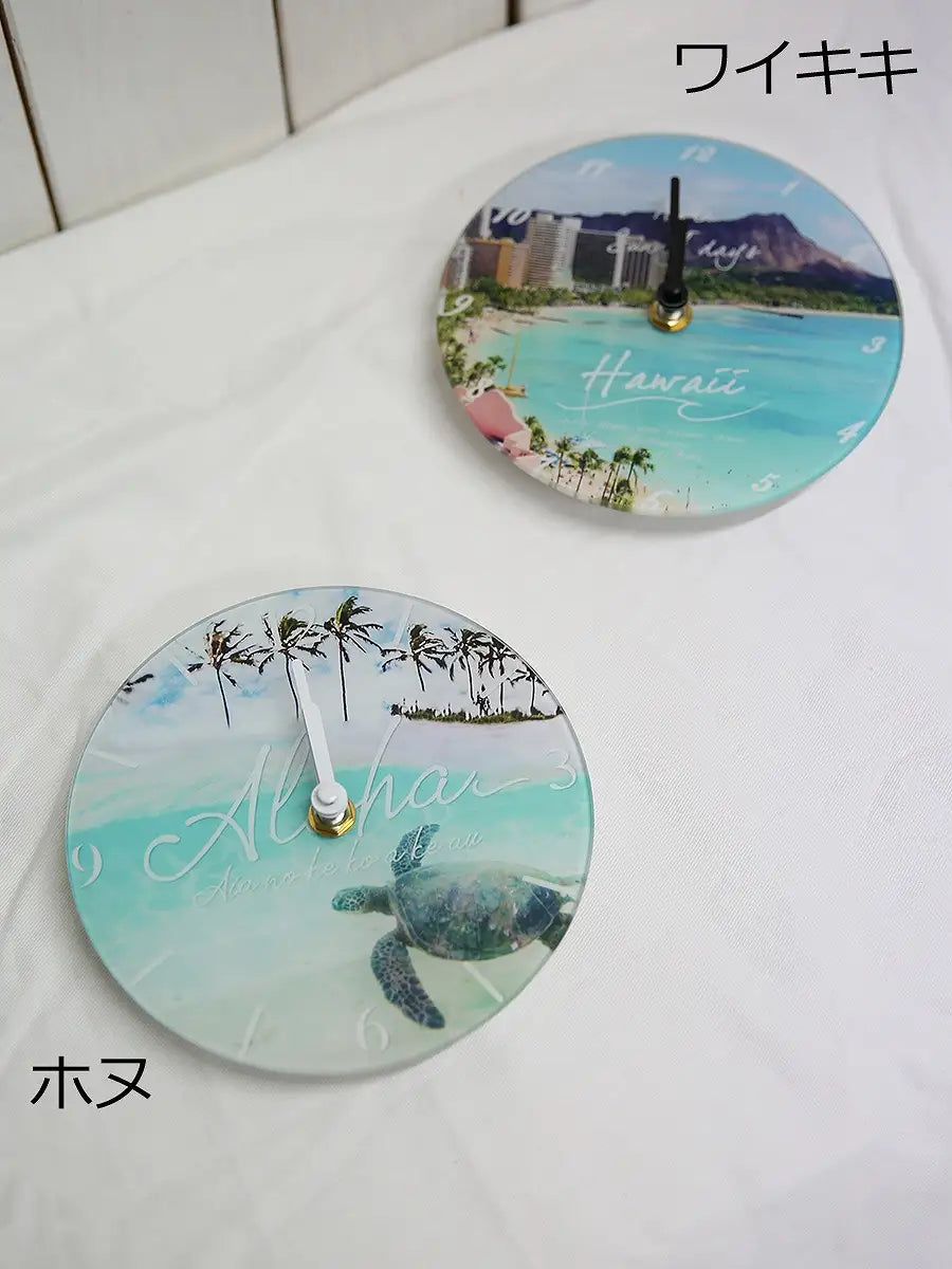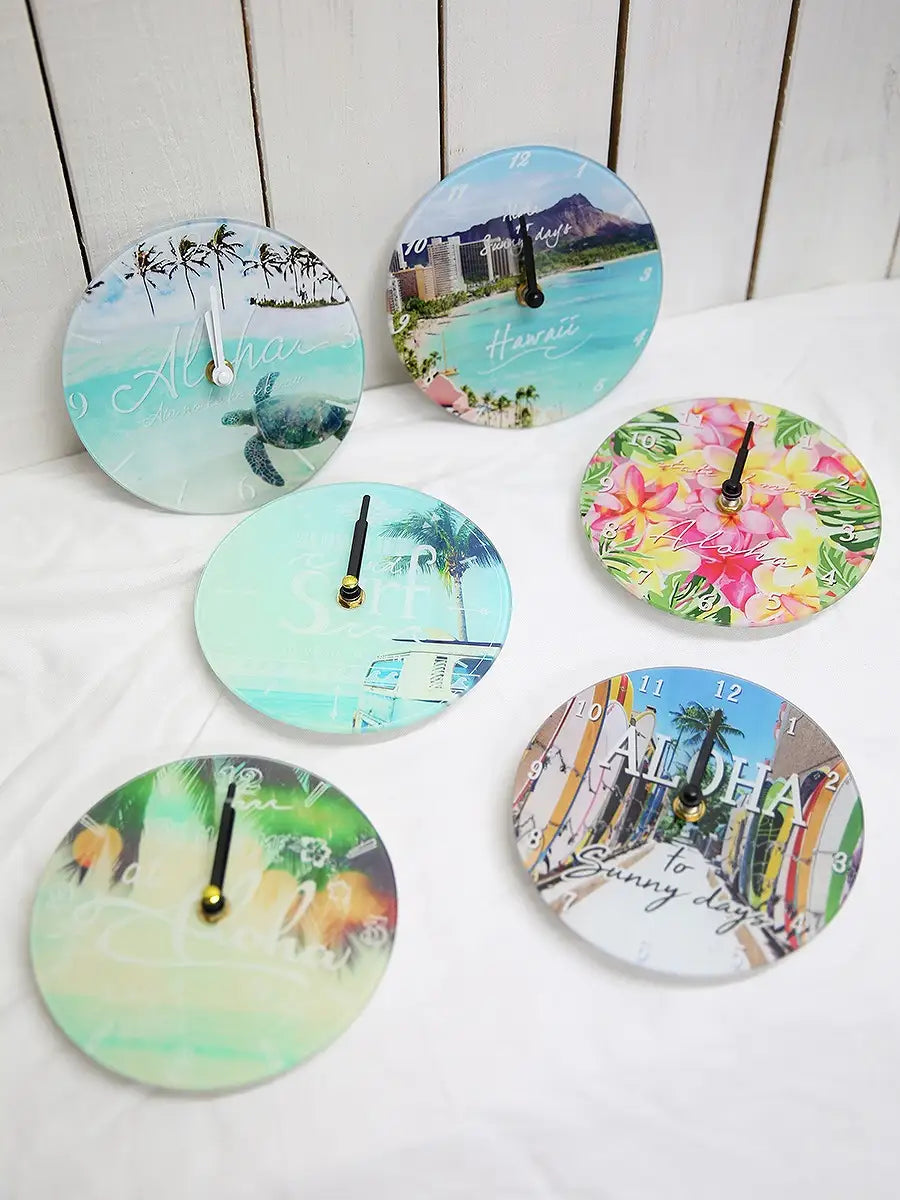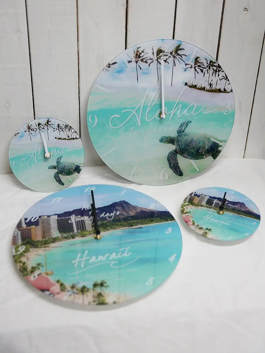 HAWAIIの町並みや、モチーフが施されたシンプルな丸型時計。br> 爽やかな海の写真がインテリアのアクセントになります。br> HAWAIIを感じながら、お家時間を楽しみませんか?br> 誕生日プレゼントや新築祝いにもおすすめです。br> 可愛いラッピング(有料)も可能です。